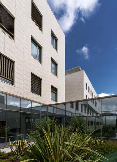 Le système pensé d’espaces verts et en plein air qui rythment le développement volumétrique favorise l’utilisation et l’exploitation maximale de la lumière du soleil et de la ventilation naturelle à l’intérieur de toutes les unités de soins. Et ce, afin d’assurer au patient « une qualité environnementale élevée dans les espaces communs, les parcours internes et les zones de repos. L’intégration physique et visuelle des espaces verts au sein de l’ensemble contribue en effet à développer l’idée d’un bâtiment centré sur le patient et sur le contrôle de l’environnement, facteur clé qui joue un rôle distinctif dans l’expérience thérapeutique. » Un grand et haut portique architectural découpé par de grands hublots ouverts sur le ciel marque l’entrée. Par analogie, l’intérieur abrite le hall d’accueil à double hauteur, marqué par le plafond à caissons quadrangulaires qui crée un double jeu d’éléments contemporains, volontairement développés à une échelle monumentale. La série Architecture de Casalgrande Padana revêt les sols intérieurs. Elle est proposée en différents formats et dans les couleurs Beige et Dark Ivory avec le traitement Bios Antibacterial®. Ce même traitement a été sélectionné pour les sols extérieurs réalisés dans différents formats, couleurs et collections : Unicolore, Marmoker, Earth, R-evolution et Petra, cette dernière en finition antidérapante. Riche en nuances, cette palette de matériaux est en mesure de répondre à la demande conceptuelle : disposer de matériaux résistants, faciles à entretenir et antibactériens, capables de soutenir l’insertion paysagère de la structure modulaire de l’ensemble architectural, également en ce qui concerne la variabilité chromatique et visuelle recherchée.