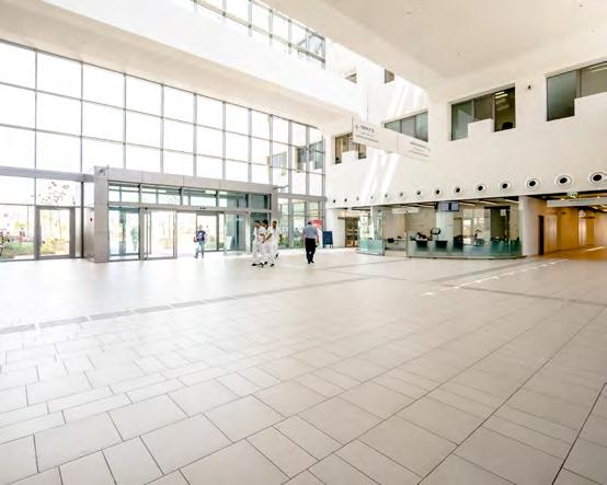 Das durchdachte System aus Freiflächen und Grünflächen, die der Gebäudestruktur ihren Rhythmus verleihen, begünstigt die Nutzung und maximale Ausnutzung des Tageslichts und der natürlichen Belüftung in allen Patientenzimmern, um so den Patienten „eine hohe Lebensqualität in den Gemeinschaftsräumen, auf den internen Fluren und in den Ruhebereichen zu bieten”. Durch die greifbare und optische Einbindung von Grünflächen in allen Bereichen wird die Idee eines Gebäudes umgesetzt, das sich auf den Gast und die ökologische Kontrolle konzentriert, was ein Schlüsselfaktor für eine einzigartige therapeutische Erfahrung ist. Entsprechend dem großen und hohen Portikus, der den Eingang mit großen, zum Himmel hin offenen Rundfenstern überragt, befindet sich im Inneren die Empfangshalle mit doppelter Höhe und einer quadratischen Kassettendecke, die zwei Elemente mit zeitgenössischem Flair schafft, die jedoch bewusst in monumentaler Größe entwickelt wurden. Für die Bodenbeläge der Innenräume lieferte Casalgrande Padana die Produktreihe Architecture in verschiedenen Formaten und in den Farbgebungen Beige und Dark Ivory mit der Behandlung Bios Antibacterial®. Die gleiche Behandlung wurde auch für die Bodenbeläge im Außerbereich durchgeführt, die in verschiedenen Formaten, Farben und Kollektionen ausgeführt wurden: Unicolore, Marmoker, Earth, R-Evolution und Petra, letztere mit der rutschfesten Oberflächenausführung Grip. Mit dieser vielfältigen Materialpalette in verschiedenen Farbgebungen konnten die Projektanforderungen an widerstandsfähige, pflegeleichte und antibakterielle Materialien erfüllt werden. Zudem trugen sie dazu bei, die modulare Struktur des Gebäudekomplexes in die Landschaft einzufügen und die gewünschte optische und farbliche Vielfalt zu erzielen.