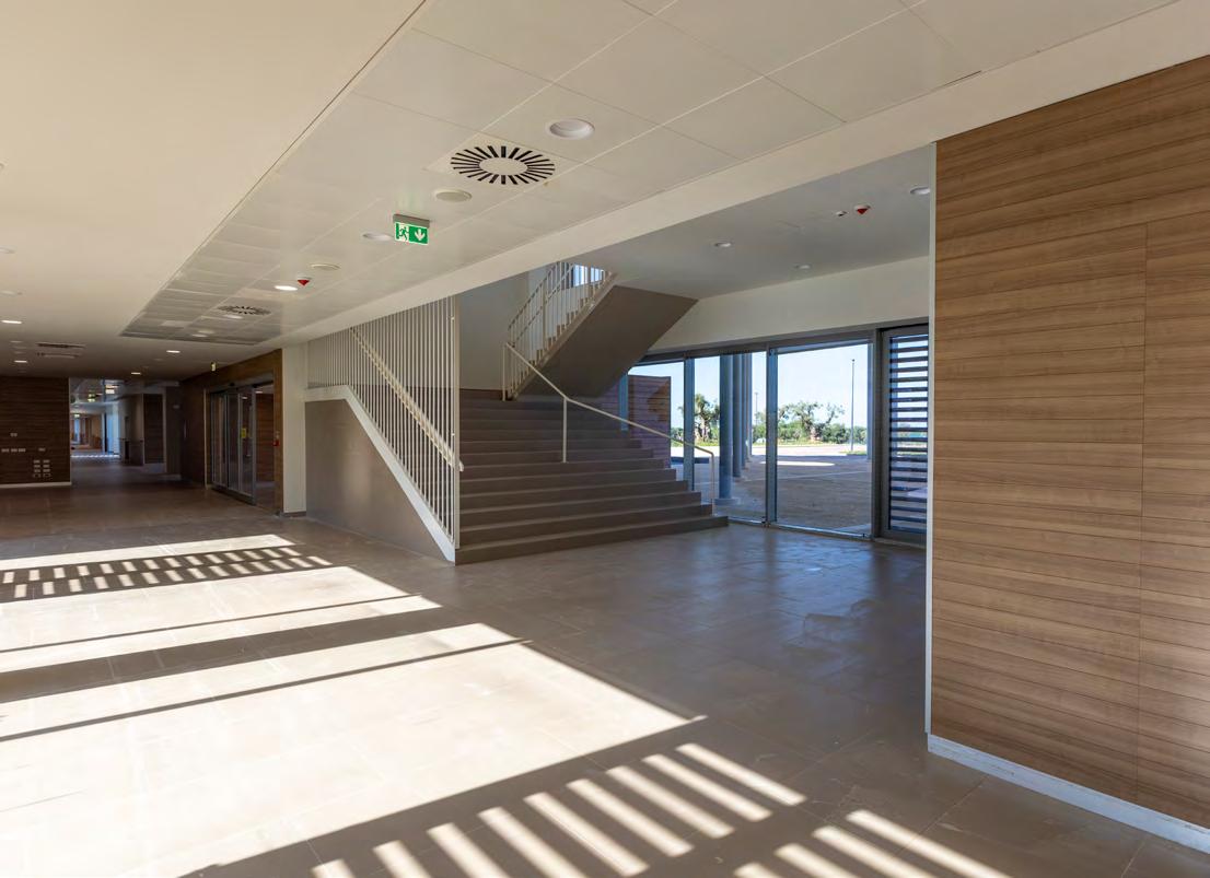 Das neue Krankenhaus für die Stadtzentren von Monopoli und Fasano im süditalienischen Apulien ist eine Einrichtung, die für ein Einzugsgebiet von rund 250.000 Anwohnern ausgelegt ist. Der architektonische Komplex ist in eine natürliche Landschaft eingebettet, die von großen Johannisbrotbaumwäldern und monumentalen Olivenbäumen von großem naturalistischökologischem Wert geprägt ist. Die Beziehung zur Landschaft war dabei der rote Faden des Projekts, das von dem auf die Entwicklung komplexer Gebäude spezialisierten Architekturbüro Pinearq aus Barcelona entwickelt wurde. Für das Projekt wurde die Entscheidung getroffen, den Krankenhauskomplex flach zu gestalten und mit nur zwei Stockwerken Höhe zu bauen, ergänzt durch ein Untergeschoss, damit er sich harmonisch in die umliegende Landschaft einfügt. Vom Grundriss her präsentiert sich das Krankenhaus als eine geordnete und modulare „Gesundheitsstadt“ mit mehreren Gebäuden, die sich wie ein Kamm entlang eines horizontalen Hauptkörpers anordnen, der die nordöstliche Achse bildet und verschiedene Höfe und Innenhöfe umfasst, die die umliegende Landschaft in die Gesamtarchitektur einbeziehen.