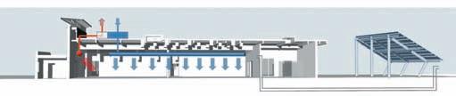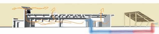 récupérée pour chauffer l'eau sanitaire et desservir aussi l'installation de chauffage. La toiture permet de convoyer l'eau de pluie dans un système de récupération qui alimente les réservoirs des sanitaires et qui sert à l'arrosage des espaces verts extérieurs, tandis qu'un réseau de cheminées solaires, surtout conçues pour éclairer les surfaces verticales des rayons de la zone de vente, diffuse la lumière naturelle qui est intégrée par des lampes à leds à haute efficacité régulées par un système automatique.
