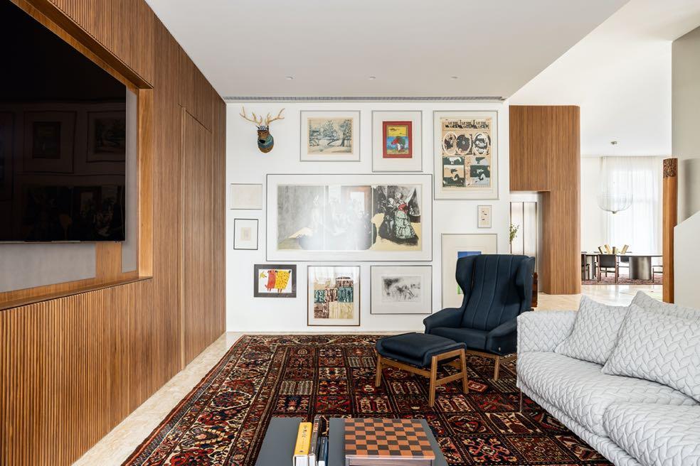 In the intimate area, the wooden floor in wide planks performs the function of coziness while the textured white walls continue to give way to works of art. It was only in the library that the architect chose to cover all the walls with the same wooden floor as the floor to give more seriousness and highlight the environment from the others.