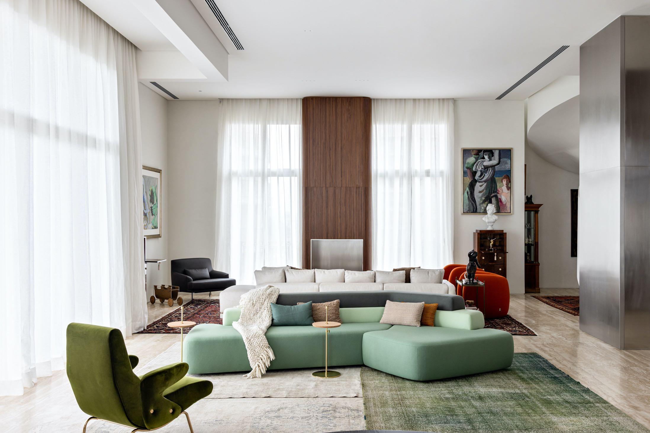 All the materials in the lounge run on the same color palette. The idea was not to create a colorful space but rather a serene and harmonious one. A modular sofa system was placed in its center, which can turn into an exceptionally cozy family lounging area in addition to the spacious family area located on the second level. An original wool vintage rug was placed under the sofa, and the curtains, which add another layer of softness to the space, were custom-made on-site due to the challenging ceiling shape & height. The theme doesn't stop there. Horowitz masterfully designed a kitchen element that emphasizes its height, a floor-to-ceiling unit that creates a semi-corridor that separates the kitchen from the guest toilets and the entrance to the master bedroom. This element serves as a focal point for the second level that seems to be floating above it.