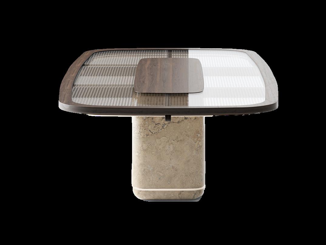 which is lined with seven tall windows on two sides. The interplay of this 'wall of mirrors' and the procession of windows, many of which are reflected therein, was essential to Leung’s design. In the main living area, Leung designed several custom pieces whose burnished, glowing surfaces bend light across the space. For example, a custom brass coffee table by Leung and the Arch bench by Pietro Franceschini lend organic curves that complement the architecture’s rectilinearity. While in the dining area, these include a brass and walnut credenza, dining table, and console set, whose irregularly shaped tops, legs, and doors play with concepts of balance and support.