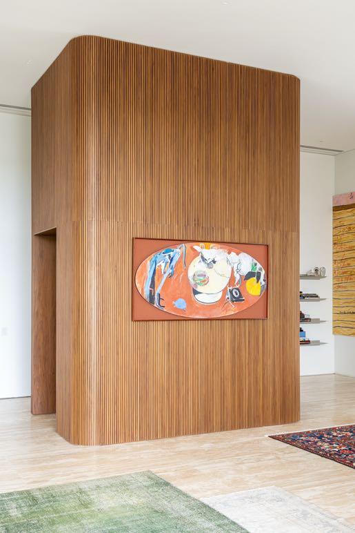 Horowitz used three of the unit’s sides - the first as a storage cupboard for crockery and utensils, a second used as a utility and storage cupboard that serves the master bedroom, and the lounge-facing third side was fitted with a wine refrigerator.