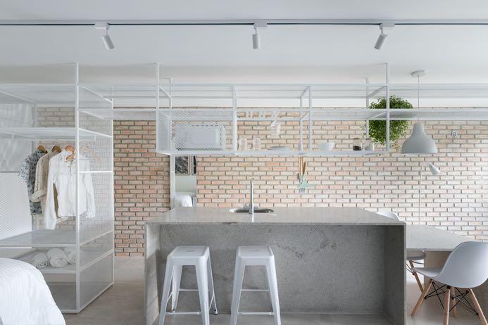 Brasília: Mínimo Arquitetura projected a space with total integration that escapes the traditional logic of division of environments and serves for short-term renting, but also could eventually house its owner (who cooks and loves to receive guests). ARCHITECTURE INTERIORS