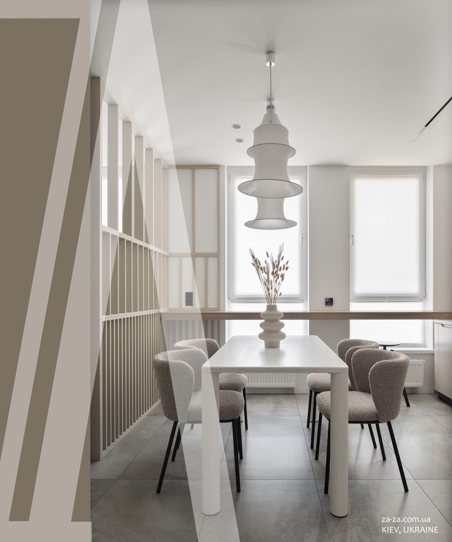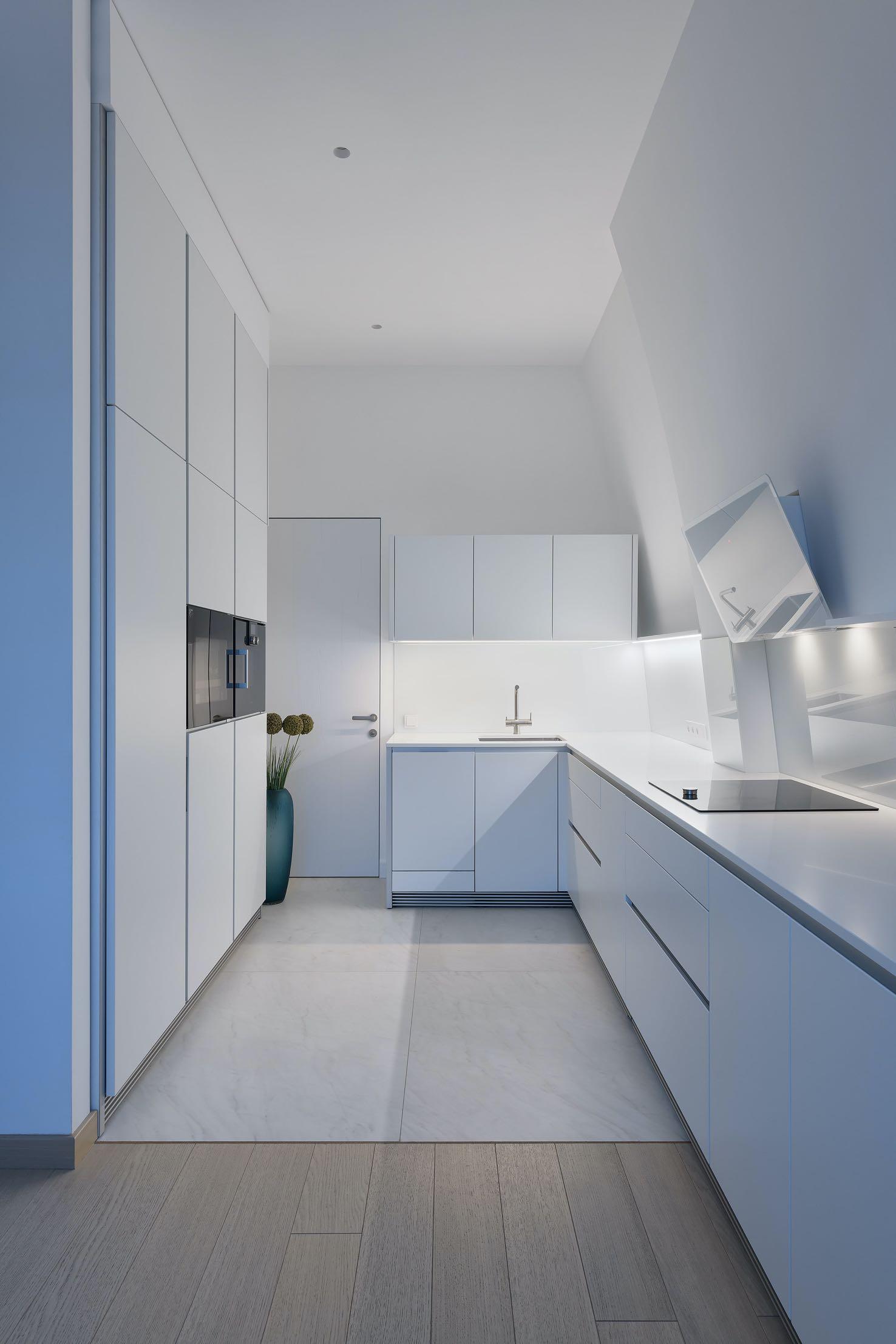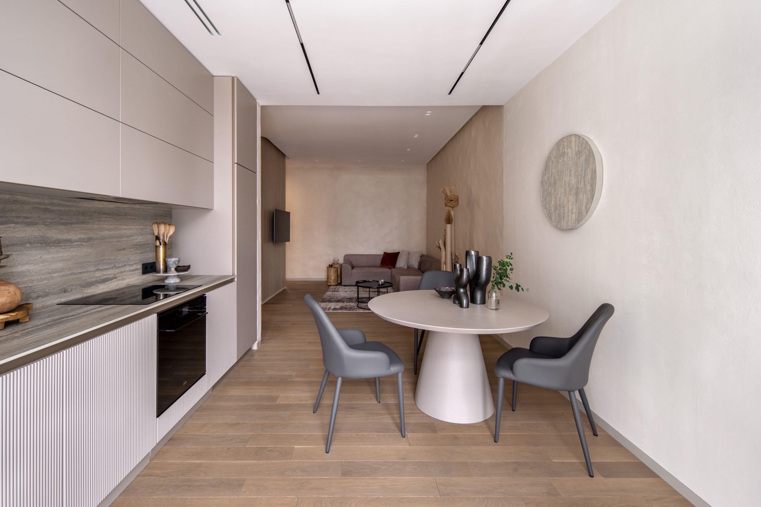 As for the kitchen, it's isolated - it's located at the back of the apartment, as it has an industrial structure, with a large hood, designed for events and celebrations. Here, the European oak wood, a light and soft material, meets in contrast with the Basaltina stone, a harder materialcompletely opposite materials that connect and integrate in a subtle and sophisticated way.
