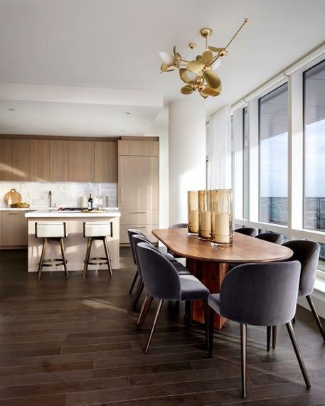 single-color balcony together with bar stools takes up the black color present in the enormous dining table and chairs; Hanging lamps above them give a touch of drama. A few designer objects on the sideboard hanging nearby complete the whole ambience.