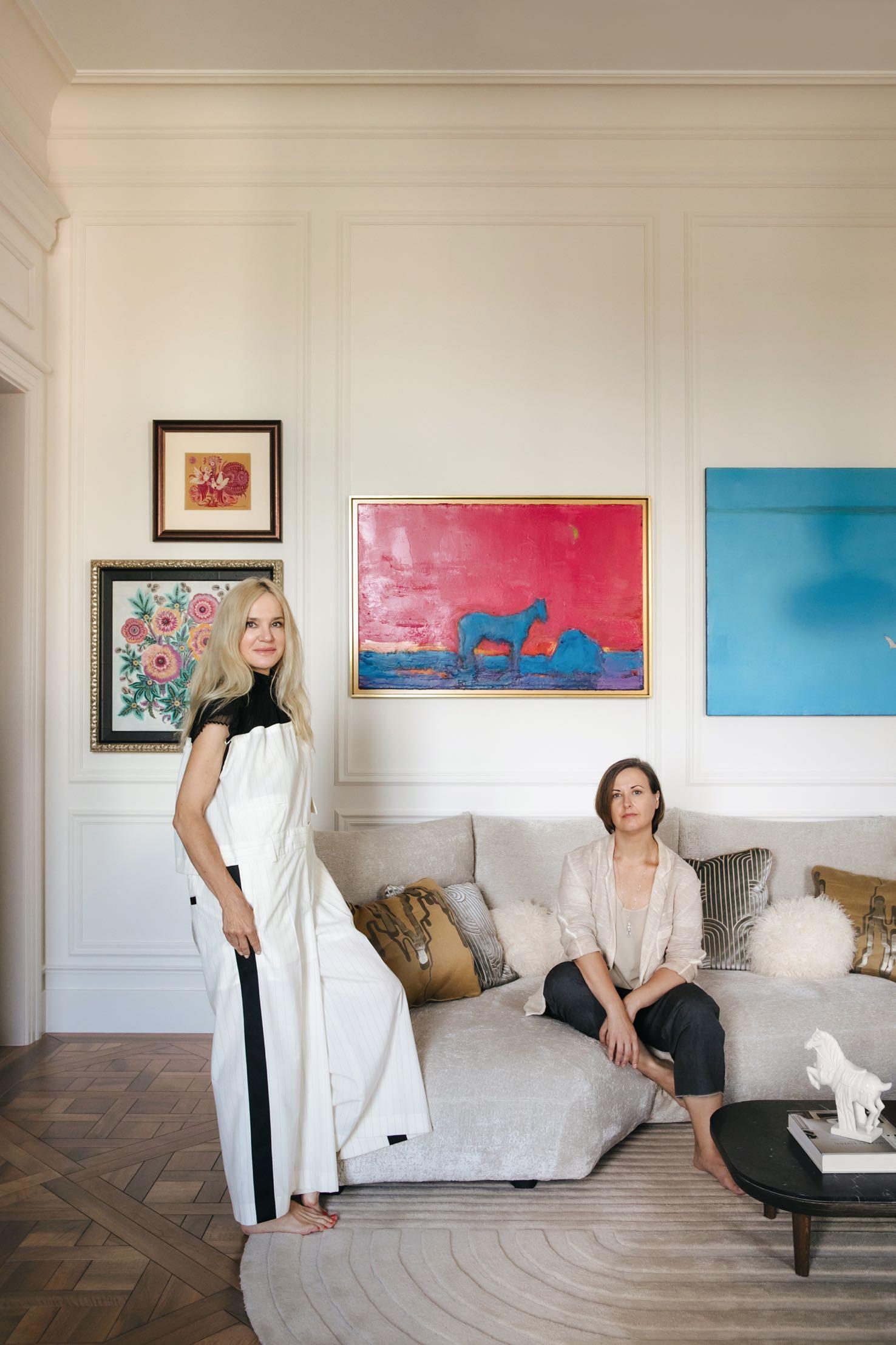 cobalt vase made from blown glass and a hand-painted jewelry box by Italian artist Filippo Carandini. Nearby there are Glass Italia’s side table and Warm Nordic’s Fried Egg armchair by Hans Olsen. The art collection in this apartment deserves special attention. It features works by some of the most renowned contemporary Ukrainian artists, whose creations have become part of Ukraine's cultural heritage. The room is complemented by Muuto rug and decorative cushions made from Misia Paris and Lamaison Pierre Frey fabrics.