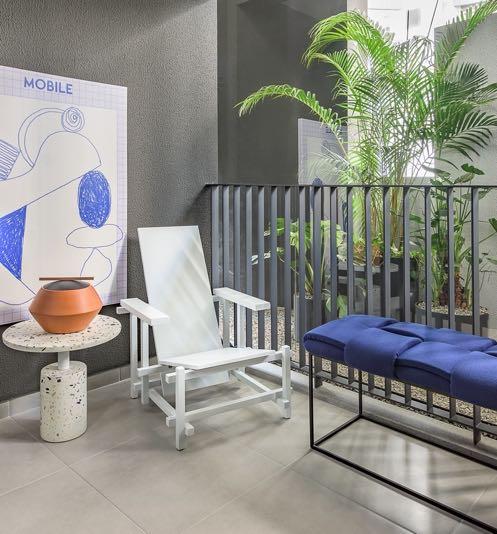 The living area is completed with gourmet balcony, which is equipped with a barbecue-grill. Here, the design shines with signature pieces. The iconic Red and Blue chair by Rietveld and the deep blue Trama bench by Humberto da Mata connect perfectly, creating a bold visual harmony between the indoor and outdoor spaces. Every detail of the apartment was thoughtfully designed to provide a unique living experience, where aesthetics and functionality coexist in perfect harmony, embodying a contemporary lifestyle with elegance and innovation.