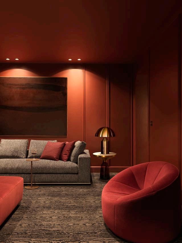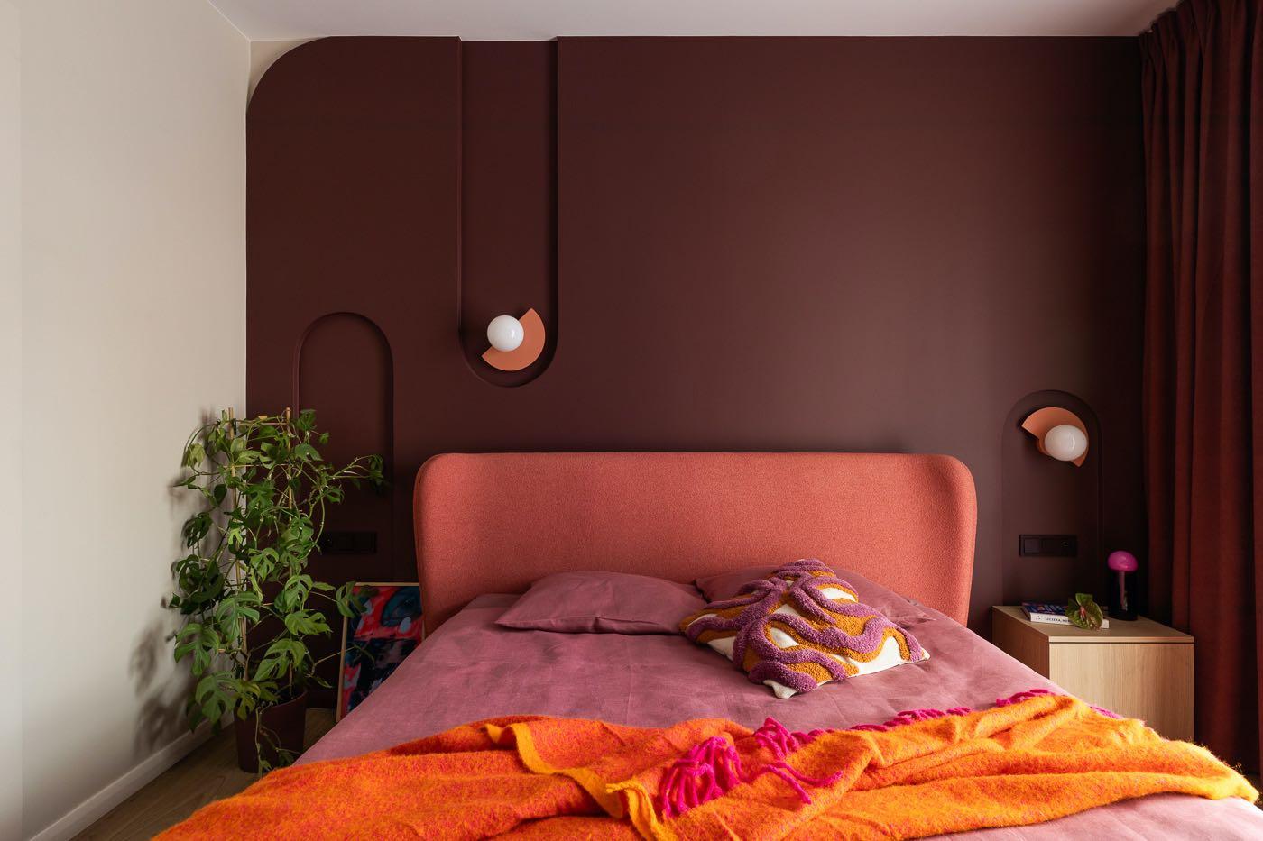 The bedroom is a haven of coziness and original design. The walls are painted a deep burgundy, and the decorative wall behind the bed features rounded niches with soft lighting. Shades of pink and burgundy are also found in the textilesupholstery, curtains, bedding, and rugscreating a cohesive color scheme. Unique elements include a bedside table and dressing table designed by the architect, perfectly complementing the room's character. The rounded forms of the furniture, accessories, and fixed elements enhance the harmonious and welcoming