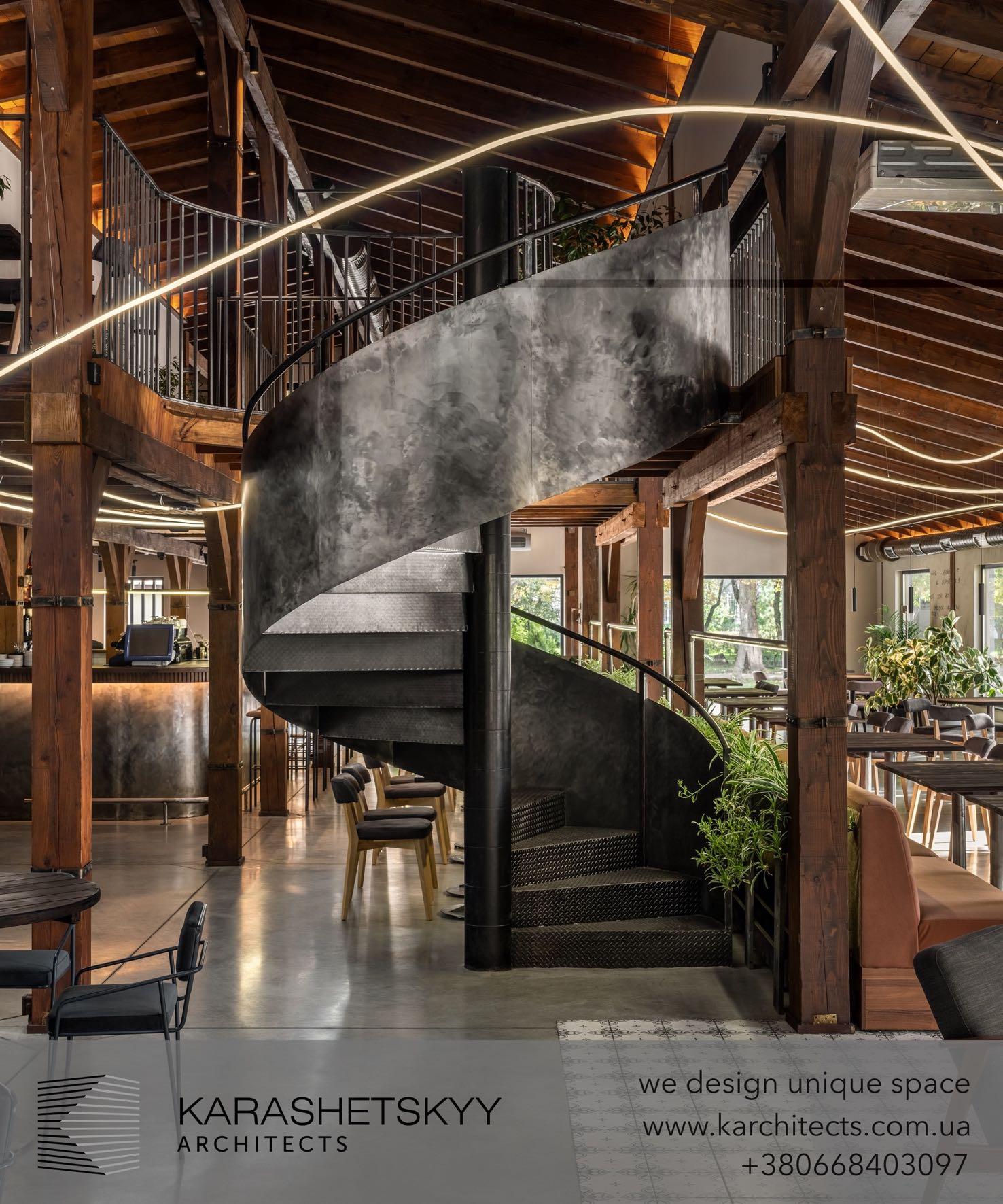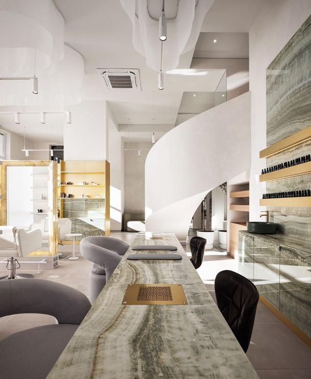 Vilchinskaya Design Bureau designed the refined beauty salon By magic Krona, where spatial challenges led to creative solutions. Key design features include a sculptural, rounded staircase that doubles as a photo zone, with mirrored walls and railings that visually expand the space. Material choices were both practical and elegant: durable porcelain stoneware paired with warm brass accents, and custom wood shelving complementing a soft grey palette that allows the onyx centerpiece to shine. www.vilchynska.com.ua