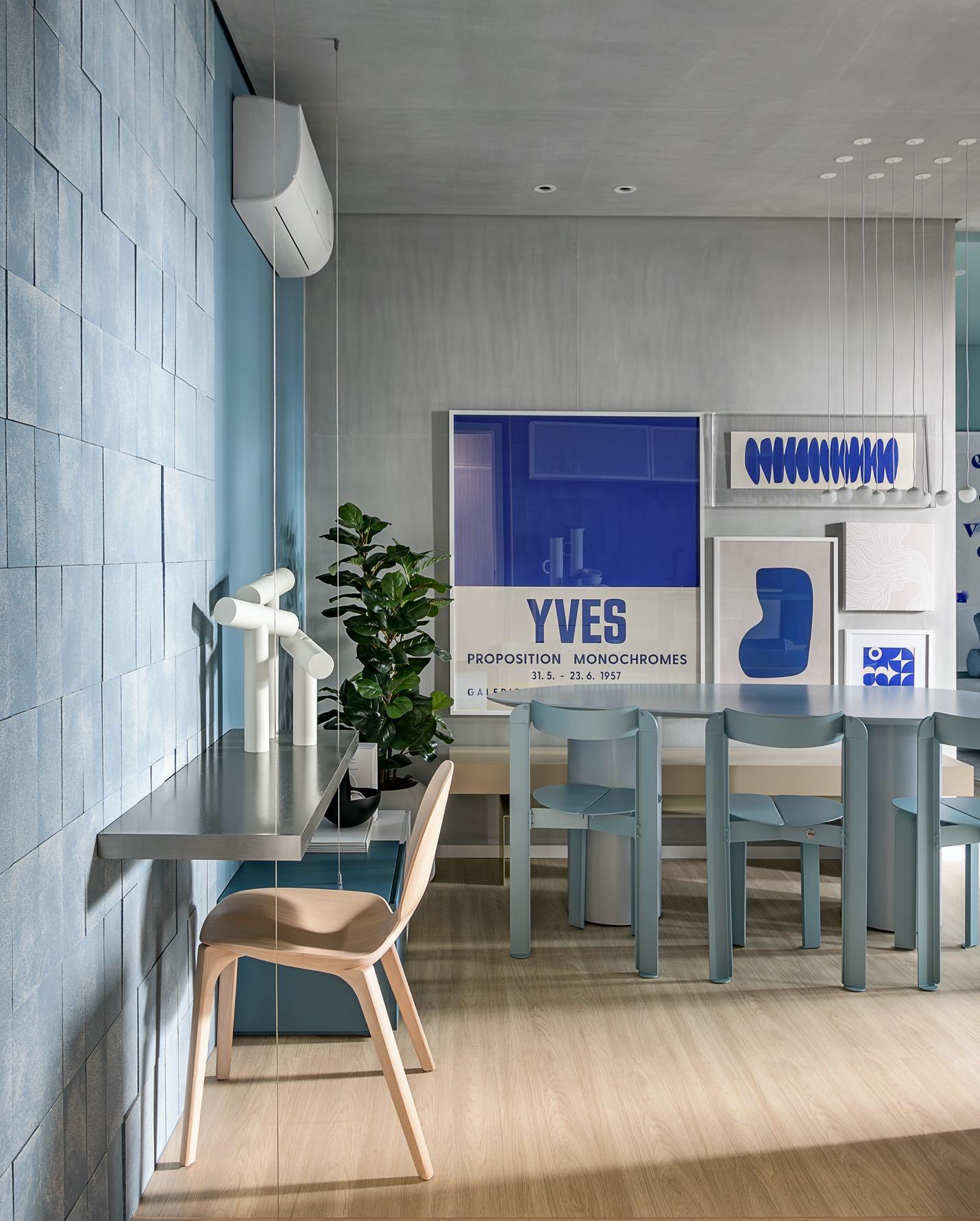 palette of deep blue tones permeates the space, creating an atmosphere aligned with a cosmopolitan lifestyle. With this innovative approach, the color becomes much more than just a detail: it is the essential element of the concept! Blue is a color that evokes a sense of infinity and transcendence, inspired by the idea of Klein Blue - one of the most iconic colors in modern art history, created by the brilliant French artist Yves Klein. The apartment stands out for its light and contemporary design, its layout optimises