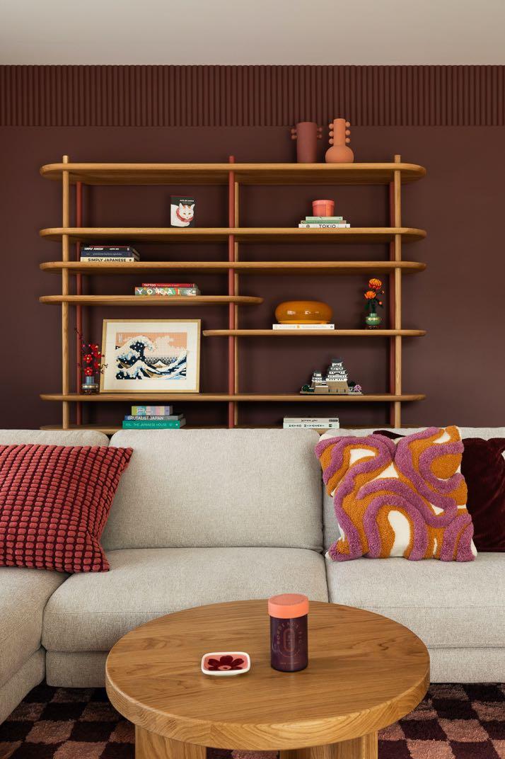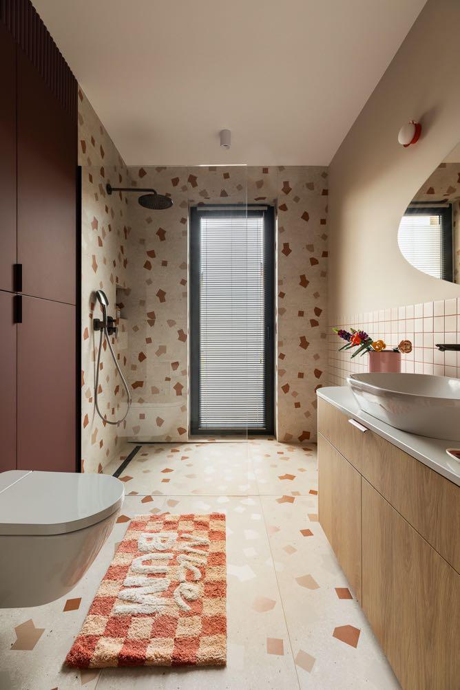atmosphere of the bedroom. The bathroom, stylistically cohesive with the living area, is another space where patterned tiles and pink-colored grout take center stage. A tall burgundy cabinet, elegantly finished at the ceiling, adds character, while a rounded vanity with a concealed cat litter box exemplifies both practicality and aesthetics. A walk-in shower ensures comfort, and a toilet with washing and seat-heating functions, inspired by the owners’ travels to Japan, reflects their appreciation for modern technology.
