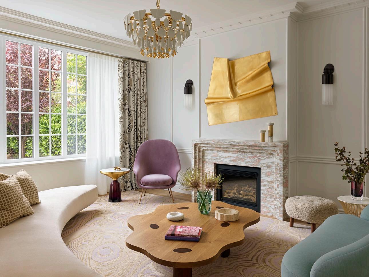 The formal lounge exemplifies bespoke luxury, pairing a soft, feminine palette of lilac and pink with contemporary furnishings. A captivating artwork by Anya Pesce, supplied by M Contemporary pairs beautifully with the stunning gold-accented porcelain chandelier from Lladro. While the Designer Rugs carpet echoes the patterns of the Norwegian rose fireplace. In the center, the organically shaped coffee table from The Invisible Collection sits - a striking, handcrafted piece in wood.
