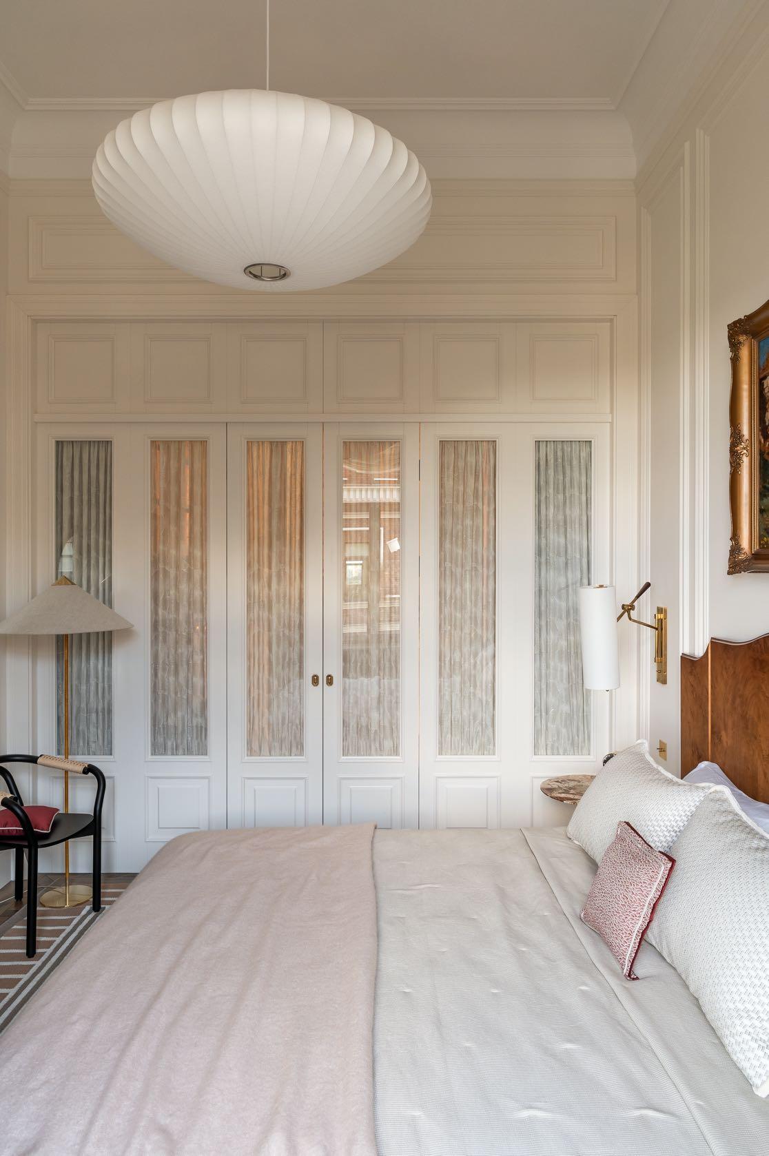 drapes on the closet doors are also by a French brand, with embroidered details from Elitis. The walls, ceiling and woodwork are painted in Argile French paint. The bed was custom-designed and covered with poplar root veneer. Marble side tables are by Llab.design, wall sconces by Visual Comfort, while the pendant light and chair are from Normann Copenhagen. The rug is from Massimo Copenhagen, and the console is by 101 Copenhagen. The back wall of the walk-in closet is adorned with French wallpaper from Papermint Paris. The closet doors are embellished with handcrafted brass frog-shaped handles by Bronzetto.