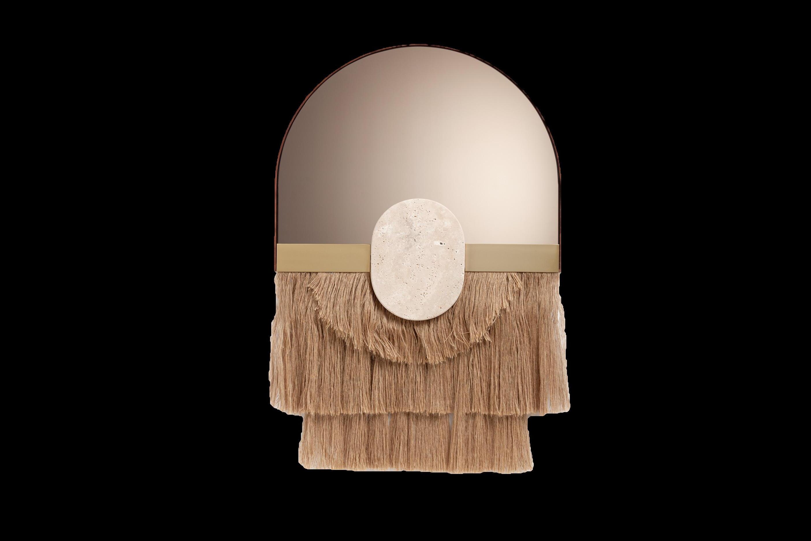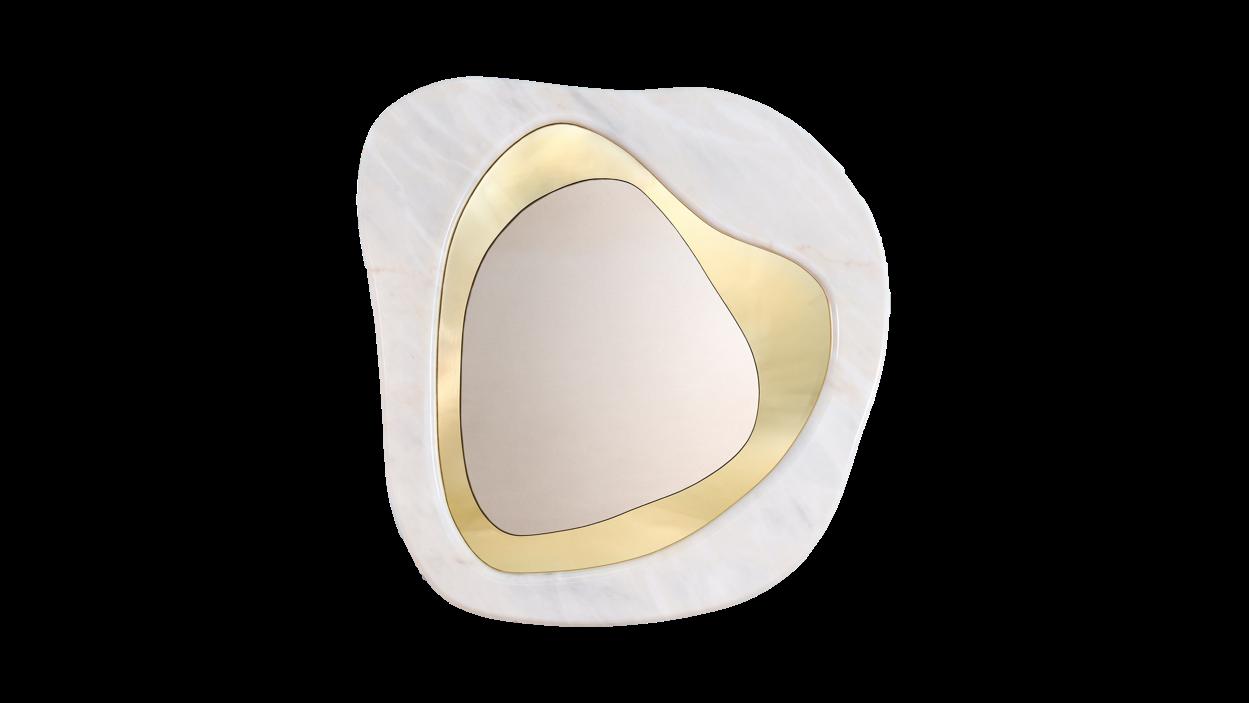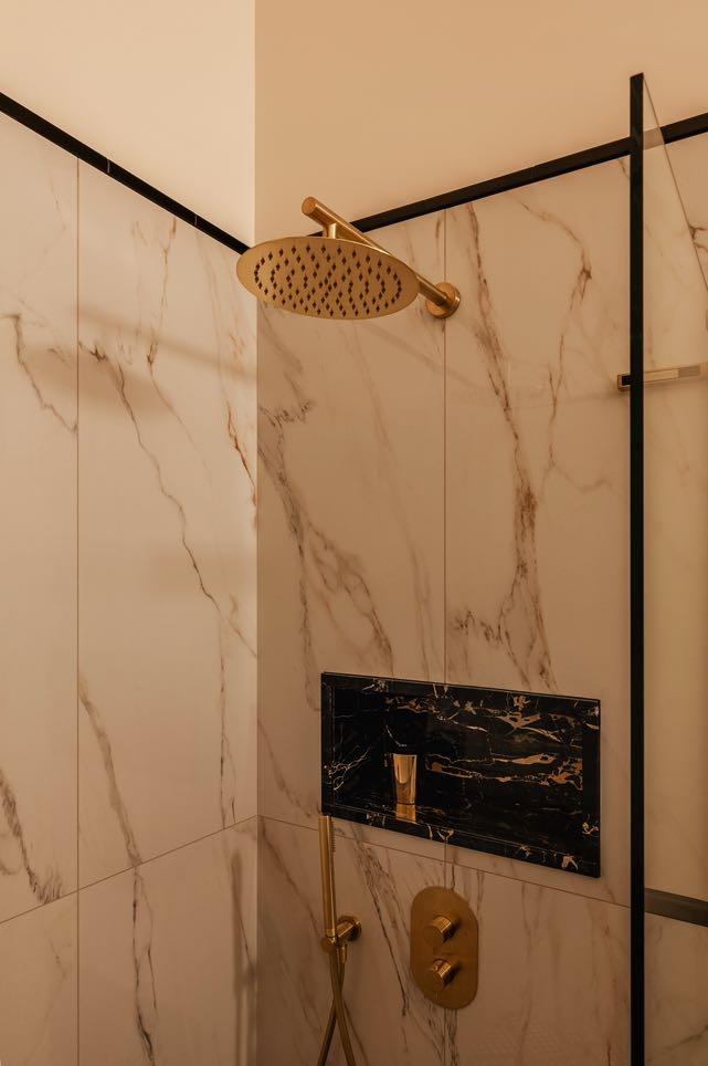 and niches in the shower are custom-made from marble by Llab.design. The mirrored cabinet with brass accents was designed to the designer's specifications. Above the cabinet, there’s Astep’s light fixture. To the left, the round wall sconce by Seletti adds a touch of elegance. The tiles and mosaic are from Vallelunga.
