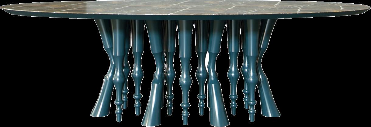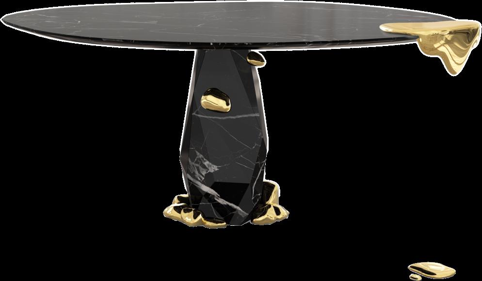 Boca do Lobo presents the Diamond dining table - a striking fusion of contemporary artistry and opulent design. It combines the refinement of marble with the artistic impact of gold details in organic shapes. Its round top rests gracefully on a base carved from Nero Marquina marble, enriched by touches of molten gold that evoke a bold contrast between the robustness of the material and the artistic fluidity. www.bocadolobo.com