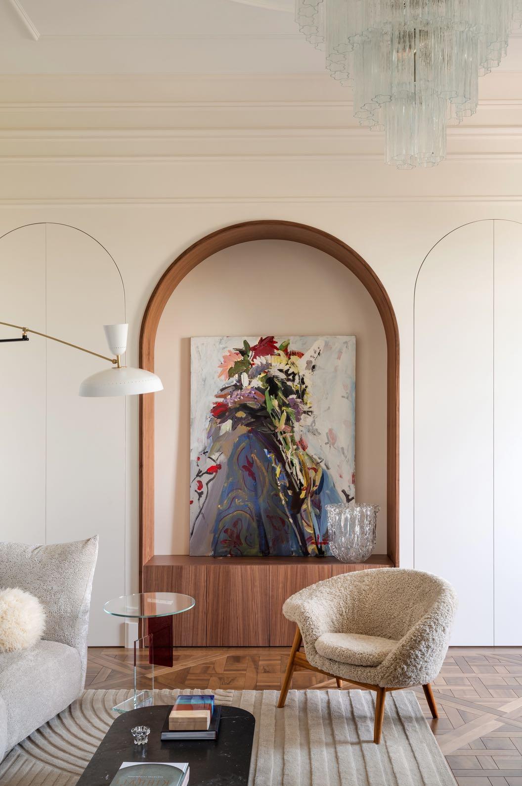 “In the central walnut arch hangs Oleksandr Babak’s painting 'Still Life. Flowers'. Originally, a TV was meant to go in this spot, but as the art was being arranged in the apartment, the painting naturally found its place, as did every artwork in the home, each choosing its own perfect spot. The owners eventually decided to prioritize art over the idea of a television.”