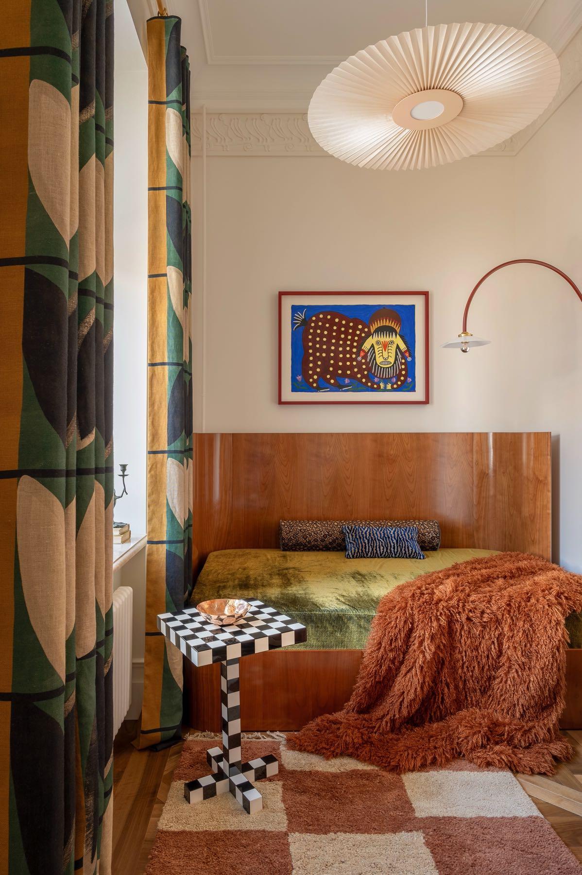 The master bedroom is richly decorated with natural textiles from the French house ‘La Maison Pierre Frey’. The curtains, pillows, duvet, and throw blanket are all crafted from this luxurious fabric. The Viennese curtain on the window and the