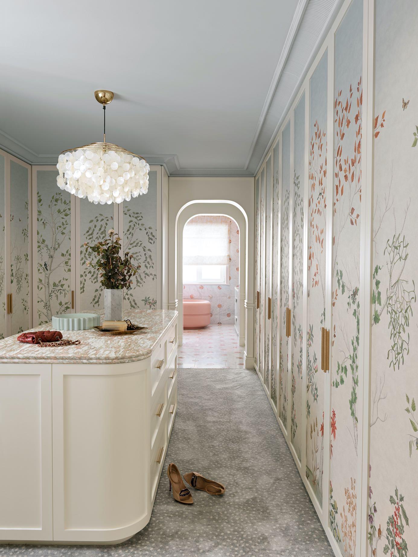 The built-in wardrobes finished in Cole & Son's chinoiserie wallpaper and a Stark spotted carpet for a soft underfoot lend an elevated elegance to this private dressing room, while the Norwegian Rose-topped dressing island introduces a touch of