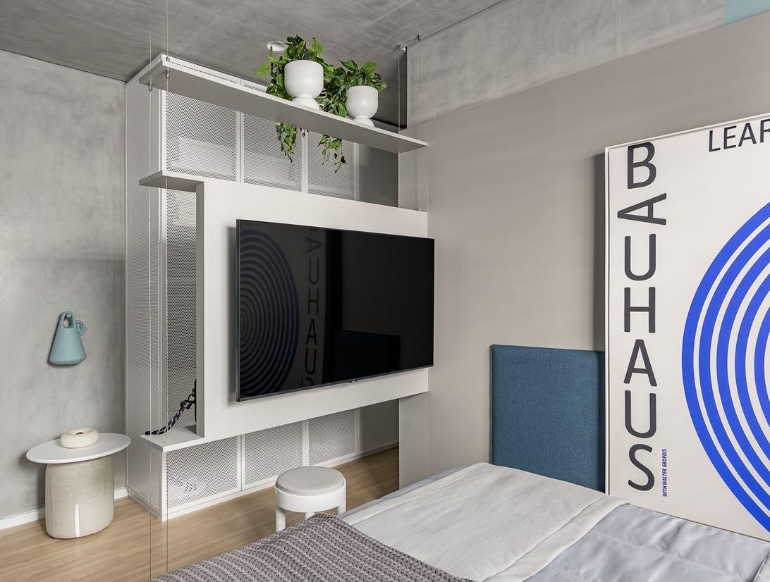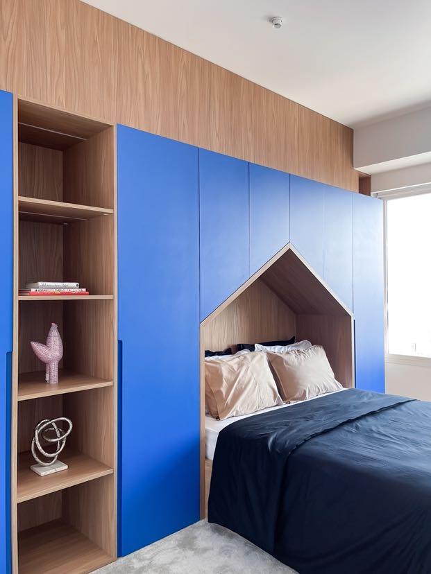 In the private area, the continuation of the blue palette is softened, and visual unity is evident in the details: the irregular, rounded shapes are maintained in the furniture and layout organization, as the multifunctional divider in the suite, which serves as both a TV panel and a vanity. The choice of materials such as stainless steel and wood for the master suite and the other two bedrooms, along with lighttextured furniture and rounded organic shapes, reflects the firm’s attention to ergonomics and comfort. Chosen to contrast with the predominant blue, the pieces - sculptures, paintings, and prints on the walls - serve as focal points, enriching the urban and contemporary aesthetic of the design. Natural light was also harnessed in these rooms to highlight the nuances of the materials.