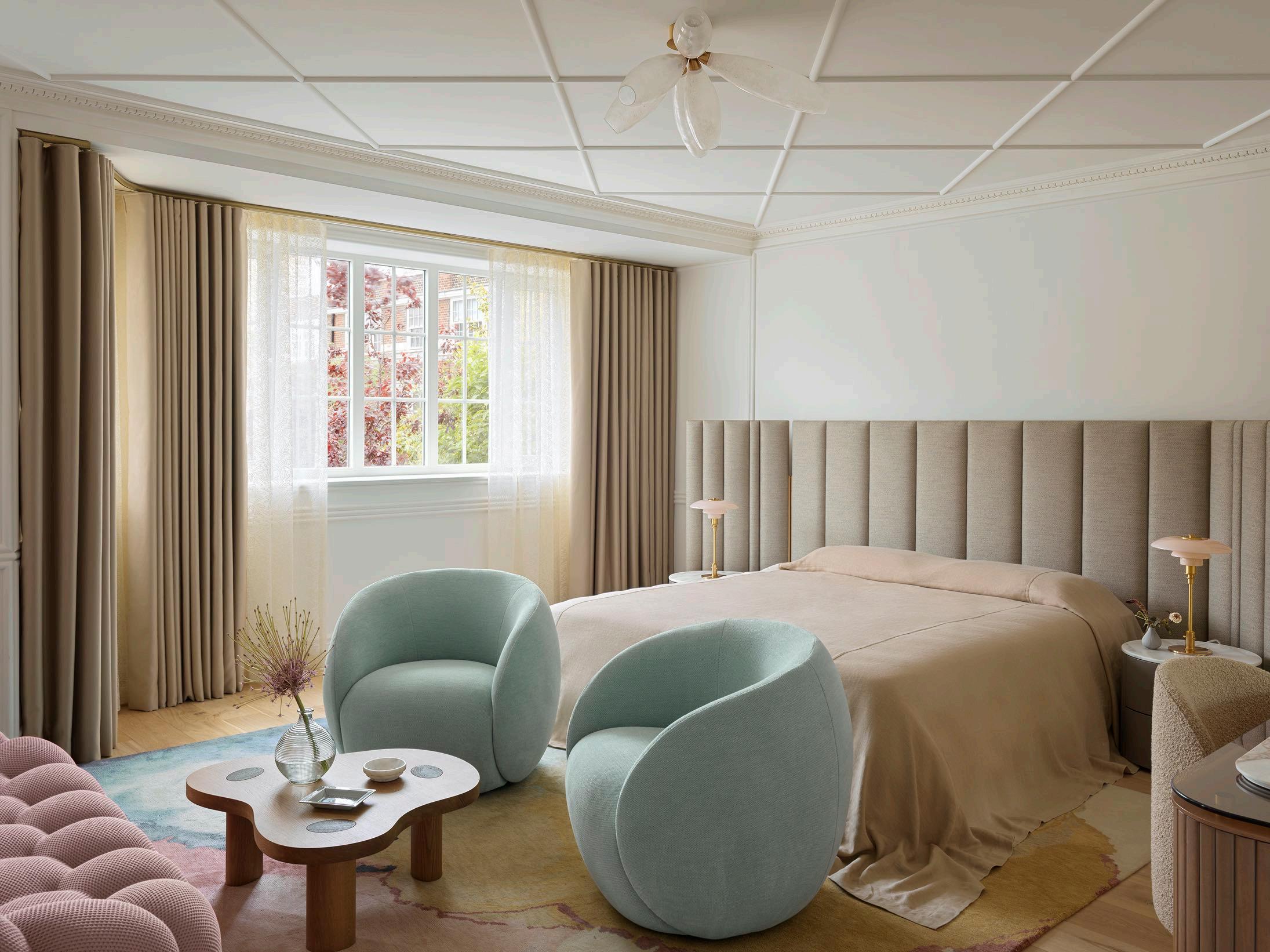 To bridge the gap between traditional and modern, Greg designed a diamond-shaped molding on the bedroom ceiling, a contemporary take on a classic detail. The designer opted for the Galotti&Radice upholstered bed with a freestanding upholstered headboard with adjustable side panels. The Rug Company’s soft, warm pattern features subtle bands of brass, pink and blue water features, which shimmer to create the illusion of movement. A pair of Roche Bobois armchairs with natural, organic lines, a coffee table from The Invisible Collection, and a vanity table complete the modern design of the bedroom.