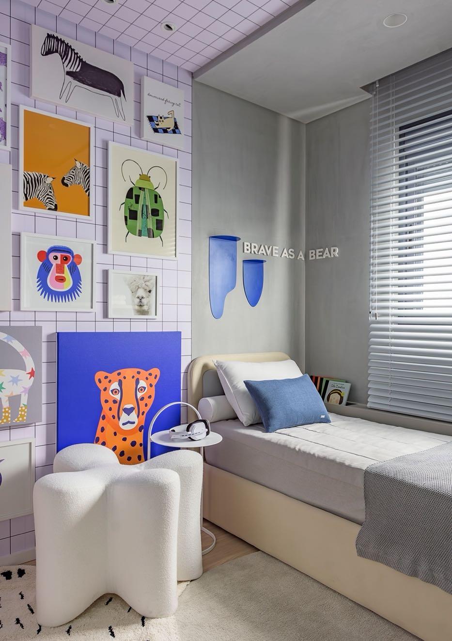 In the children's bedroom, creativity takes flight with a mini art gallery and an adorable plush giraffe that dominates the space. These playful details make the room not only visually appealing but also an inspiring place for children's imagination and development.