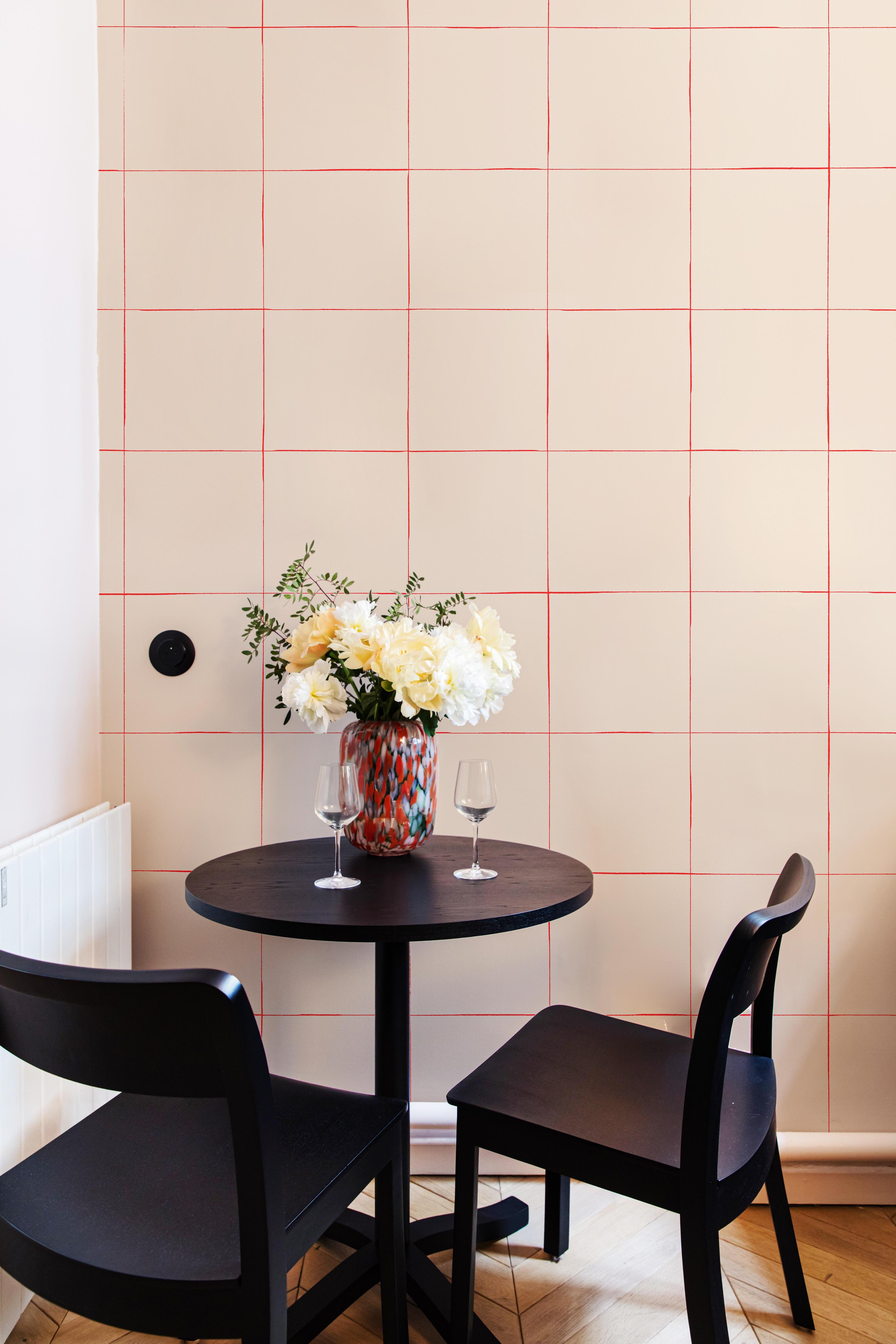 At the heart of the home lies a uniquely designed kitchen, where every element has been meticulously planned. Neutral beige and white tones dominate, serving as a calm backdrop for bolder accents. The kitchen features a distinctive pink island with a rounded shape that harmonizes beautifully with the burgundy and wooden cabinetry. Above the cabinets are small tiles with colorful grout, adding charm and lightness to the space. The kitchen floor features modern tiles with a geometric pattern that complements the rest of the interior.