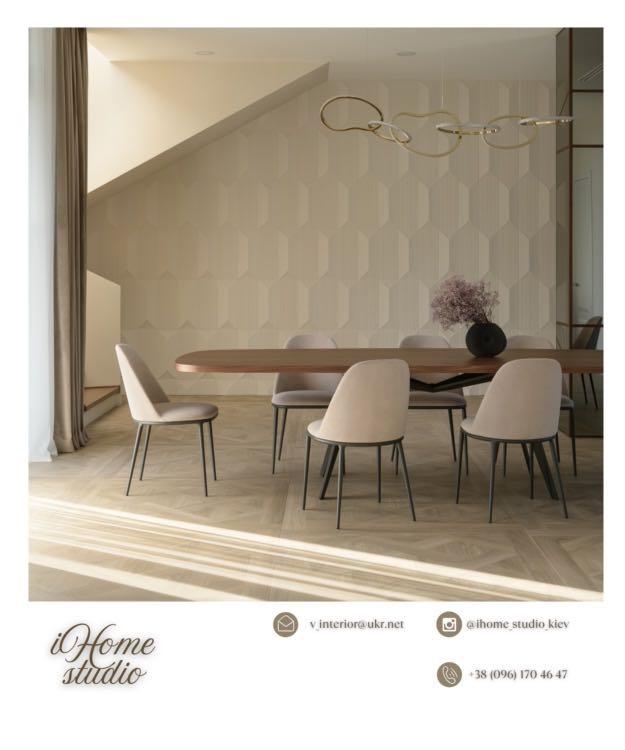 The block of cabinets, clad in white wood, harmonizes with the cream tones of the walls, delineating the kitchen area and concealing a guest bathroom. Integrated handles and concealed hinges keep the aesthetic crisp and unbroken, allowing the cabinetry to read almost as architectural wall treatment rather than kitchen storage. At its center stands a monolithic island clad entirely in honed travertine (same as the bathroom sink) - its warm, sandy veining lending an organic richness to the otherwise tonal space. The stone’s subtle texture anchors the kitchen with a grounded, earthy presence, offering both visual and tactile contrast to the surrounding smooth surfaces. The solid wood bar stools, Scandinavian in style, sit tucked beneath the island, their rounded seats and lightly tapered legs showcasing craftsmanship through simplicity. The light oak finish harmonizes with the travertine and reinforces the room’s commitment to a warm, natural palette. A discreet metal footrest on each stool adds a practical, contemporary touch. A stainless-steel double-door refrigerator adds a subtle note of industrial contrast without disturbing the tonal harmony. Above the island, a razorthin linear light fixture is suspended delicately, casting an even glow without drawing attention to itself an exercise in thoughtful understatement.