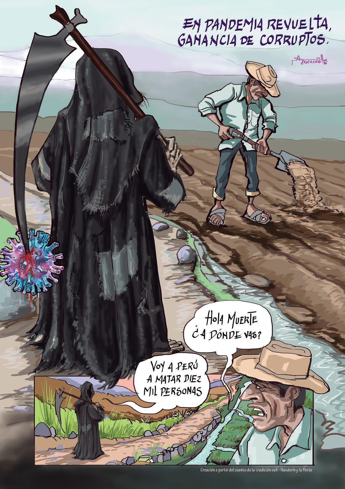 Y ya cerrando nuestra tercera edición, la sección de Opinión y crítica viene con un vivido y revelador texto alrededor del libro José Sabogal, el entorno americano, del investigador Santiago Salazar Mena, y el reconocido artista de la caricatura e historieta del sur del país, César Aguilar, quien además, actualmente es docente de la ESABAC y nos regala una de sus más recientes entregas gráficas, “En pandemia revuelta, ganancia de corrup tos”, una muestra más de su crítico trabajo artístico.