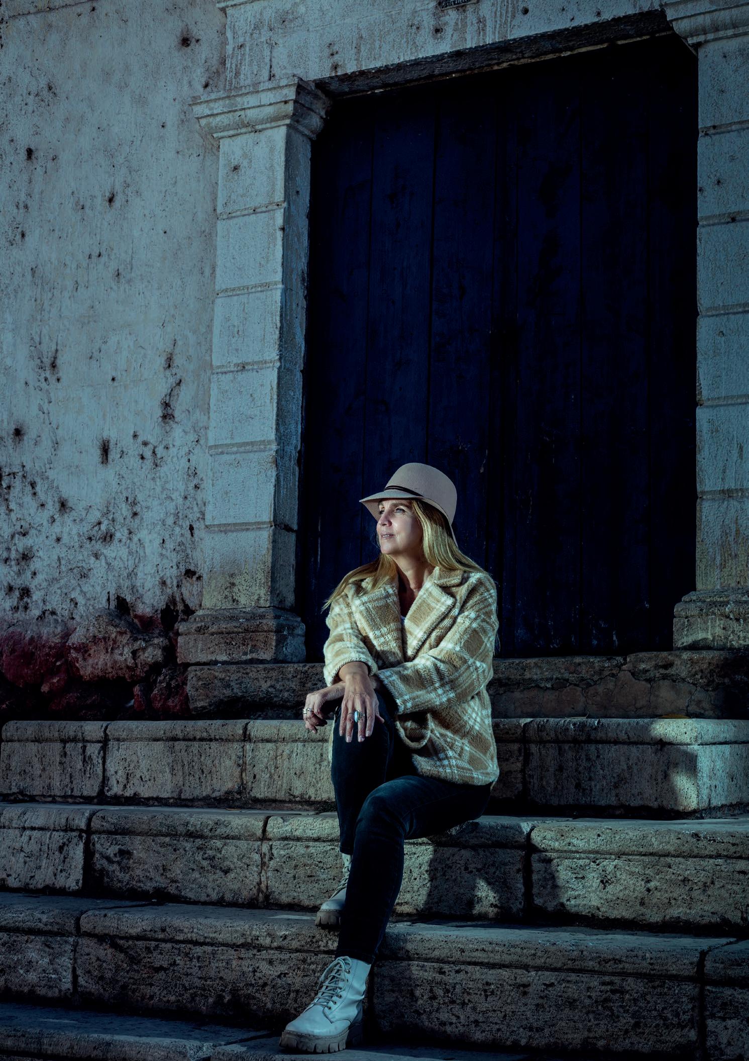 Artista Sonia Cunliffe en la fachada de la casa de Clorinda Matto de Turner en Tinta, Canchis. Fotografía: Gustavo Vivanco, 2021.