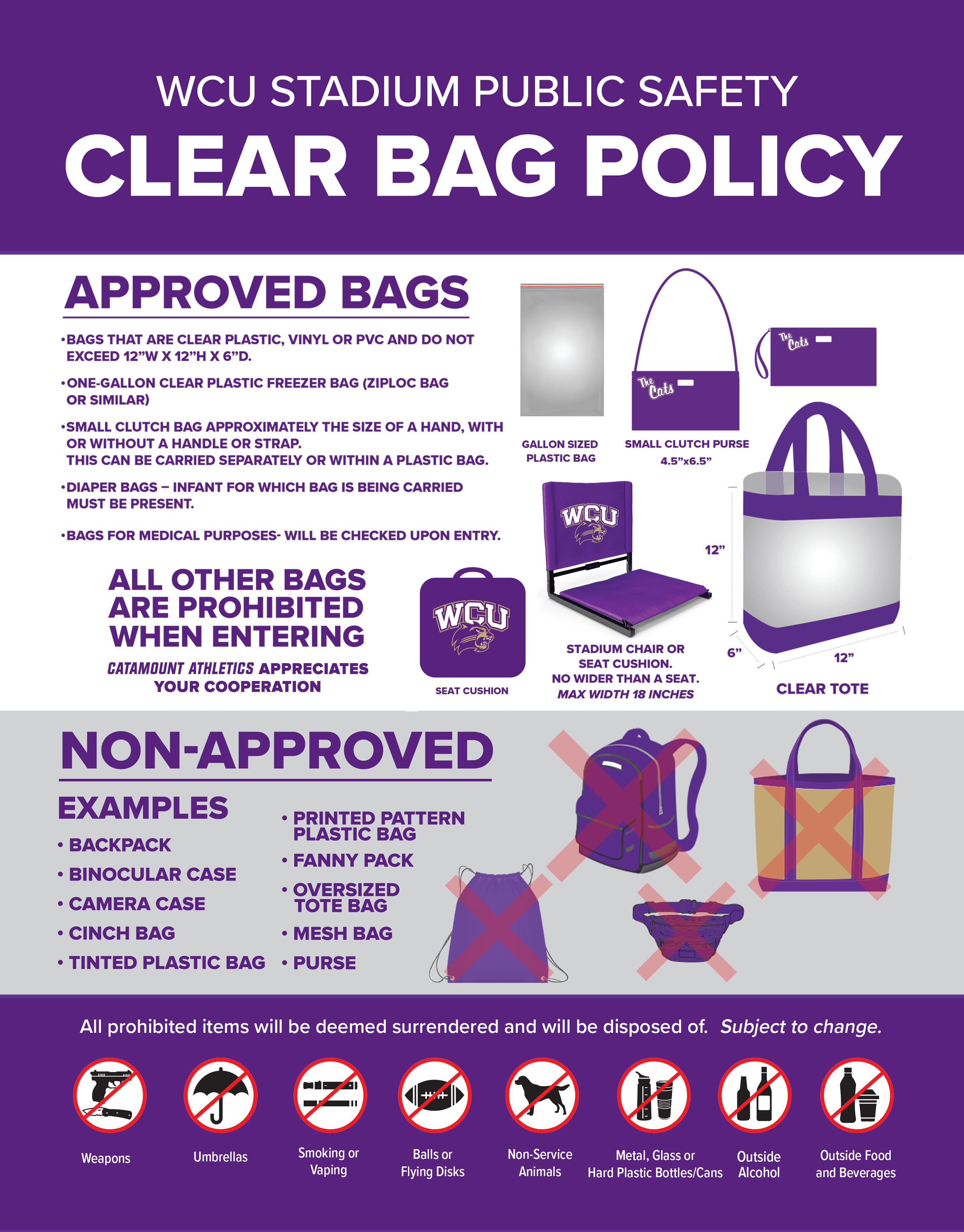 Western Carolina University abides by a "Clear Bag Policy" – ALL parcels, bags and alike are subject to inspection upon entry into E.J. Whitmire Stadium. All alcoholic beverages, outside food and beverages, and other items not permitted in the stadium must be discarded prior to entering the stadium. Ticket holders are allowed to bring one empty, clear plastic water bottle into the stadium for use at the stadium water fountains. See Page 7 for more info.