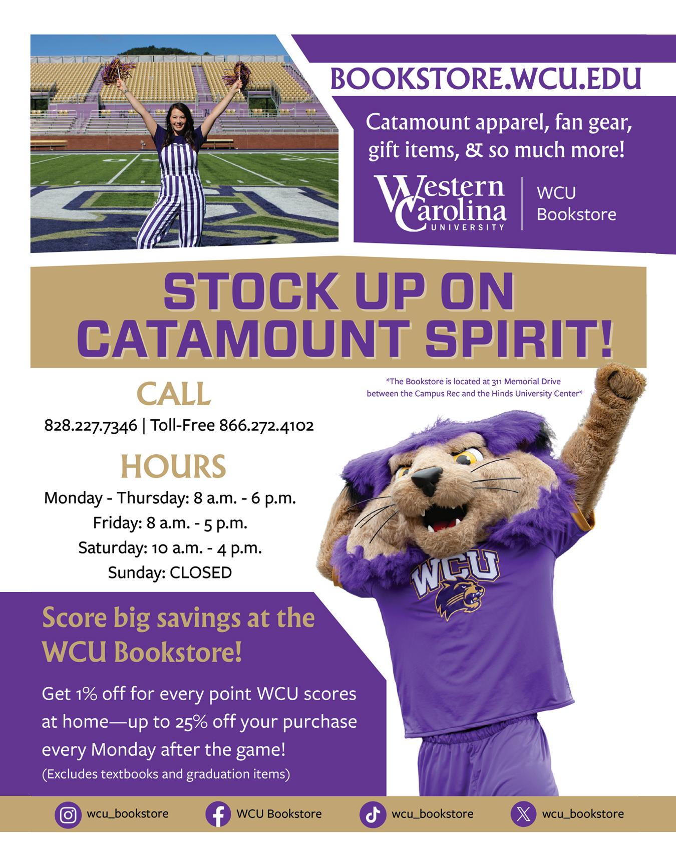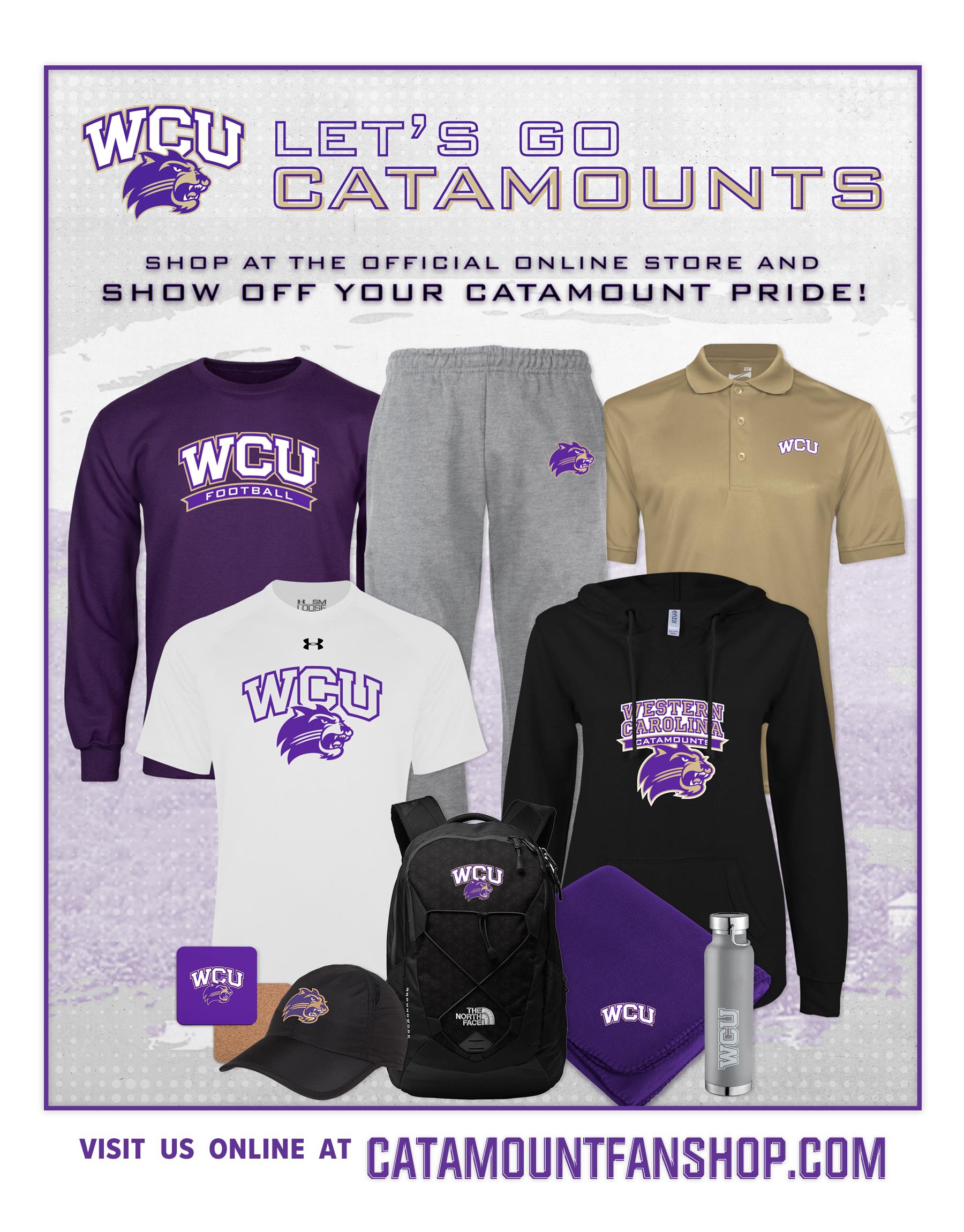 Western Carolina apparel and game day merchandise from the WCU Bookstore can be found at stands on both sides of the stadium near Gate 1 and Gate 4. The WCU Bookstore is open on home game days from 10 am until 4 pm – and anytime online at bookstore.wcu.edu. Merchandise is also available anytime at CatamountSports.com through CatamountFanShop