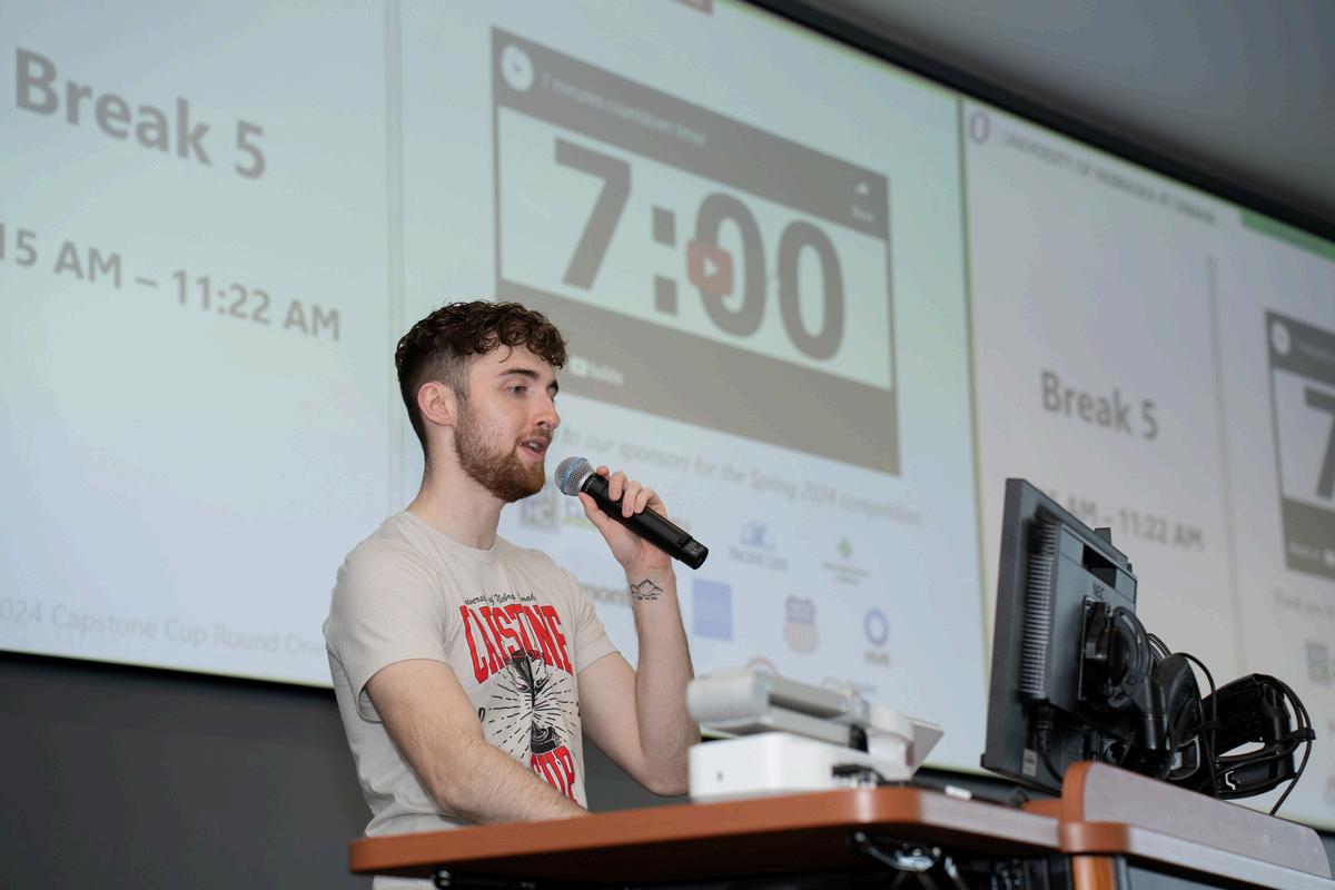 The Capstone Cup Graduate Assistant is the ‘engine’ that makes this event go. Kaleb Heckens joined the team in Fall 2023 and hit the ground running He wrote the case briefings under the guidance of the Capstone Cup Director (Erin Miles); coordinated with our case partners, photographers, and volunteers; and in general made sure things went as planned.