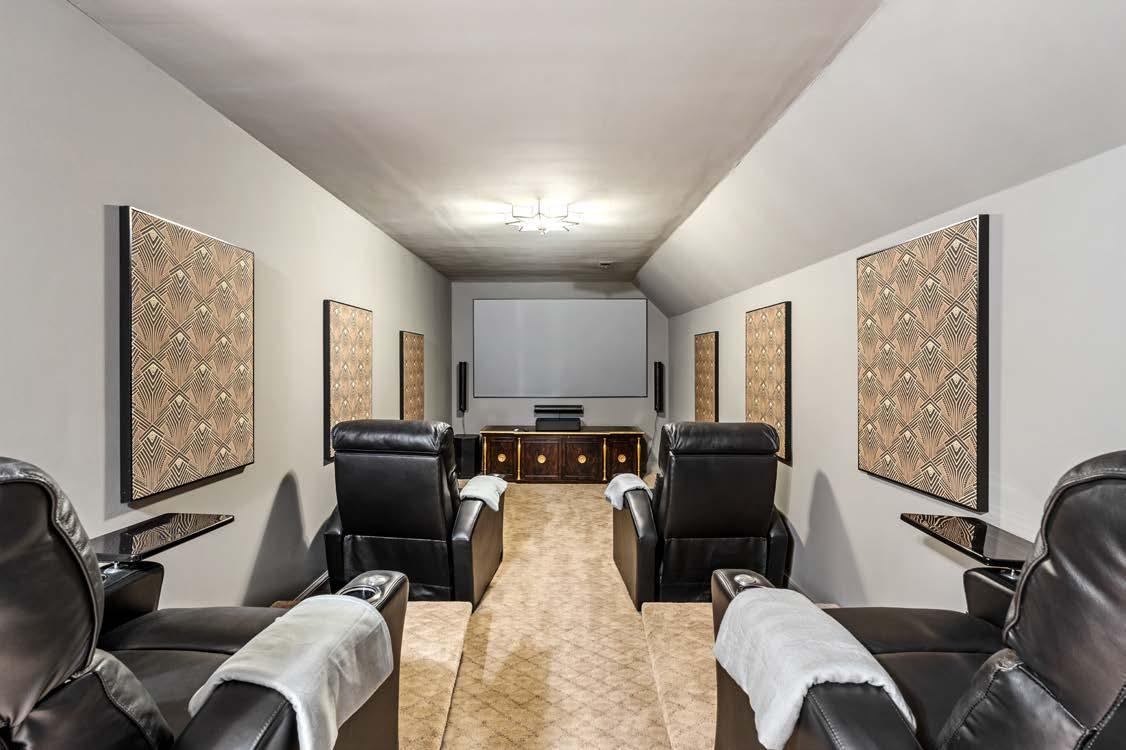 Three additional bedrooms are thoughtfully arranged to provide privacy and flexibility. A private home theater creates a cinematic experience, while a versatile flex room is ideal for a fitness studio, playroom, or additional living space.