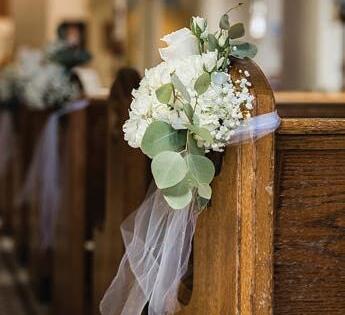 Following the ceremony officiated by a close friend, guests mingled and indulged during cocktail hour, before moving into the ballroom for dinner and dancing. The reception tables were decorated in floral arrangements repurposed from the ceremony for a cost-effective way to maintain consistency without breaking the bank. The centerpieces were accented with votive candles for a romantic touch, as well as white and gold linens and gold table numbers offered by the venue.
