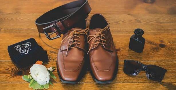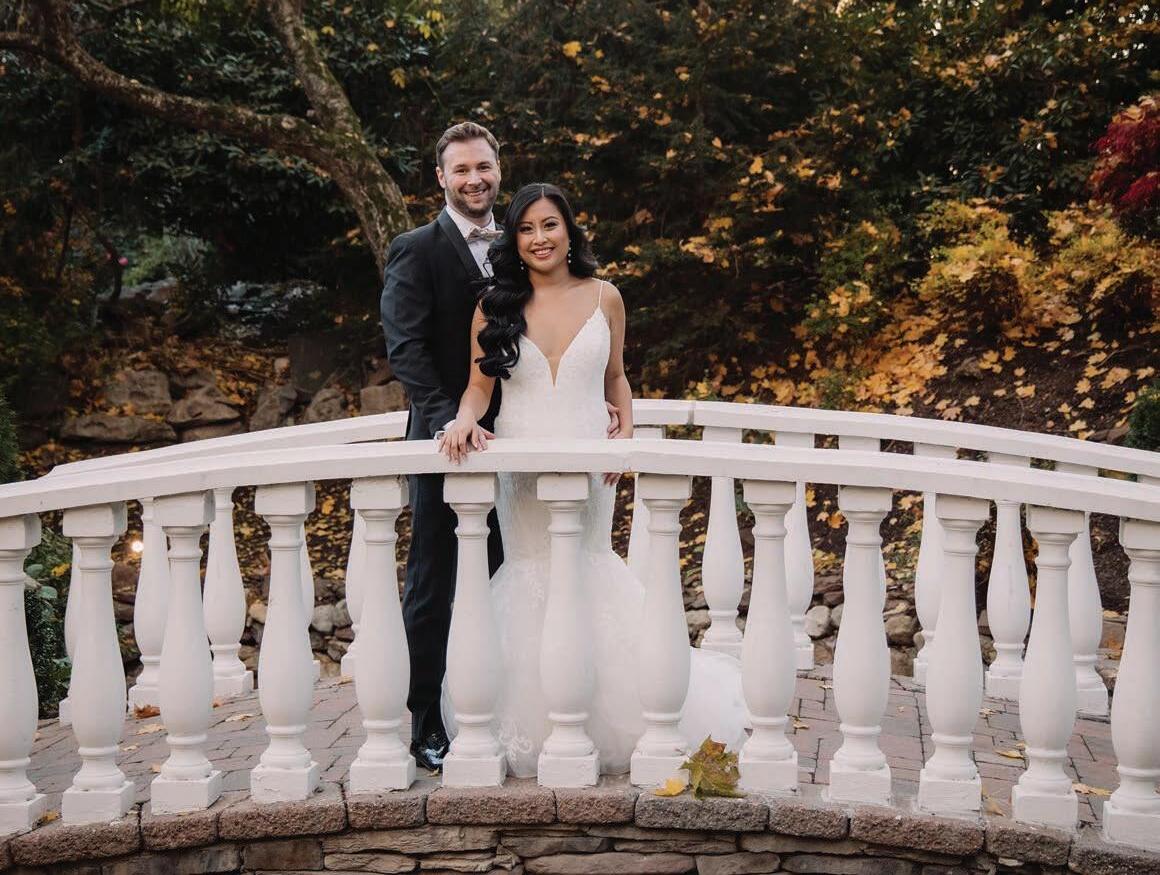 Melissa tried on 20-plus gowns until she found the boho-style gown of her dreams. She donned a form-fitted dress designed by Essence of Australia, with a low-cut back embellished with buttons and intricate beading and lace detailing that stood out with a rum-colored underlay. A gold diamond tennis bracelet and gold teardrop stone earrings completed her wedding day look. Jon sported a navy-blue tuxedo with white damask tie and matching pocket square, brown dress shoes, and custom navy socks with artwork of their dog, Finn, on them.