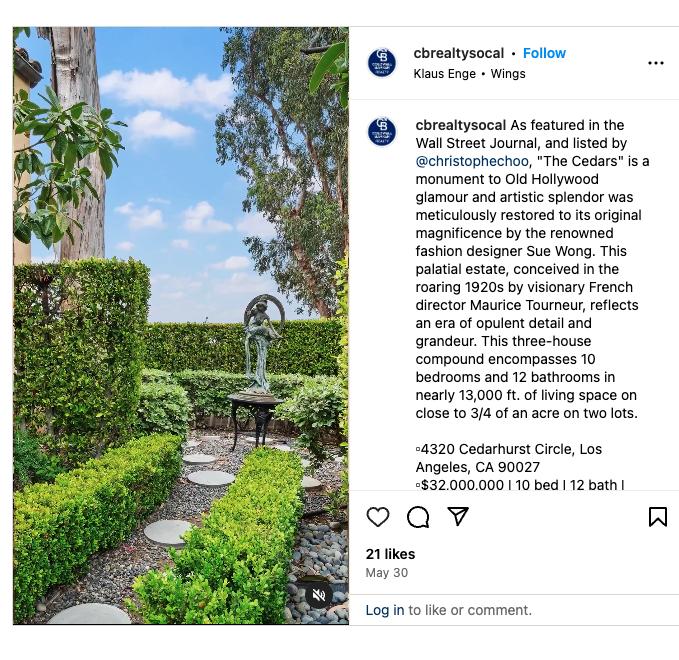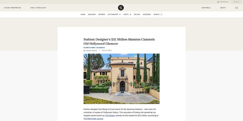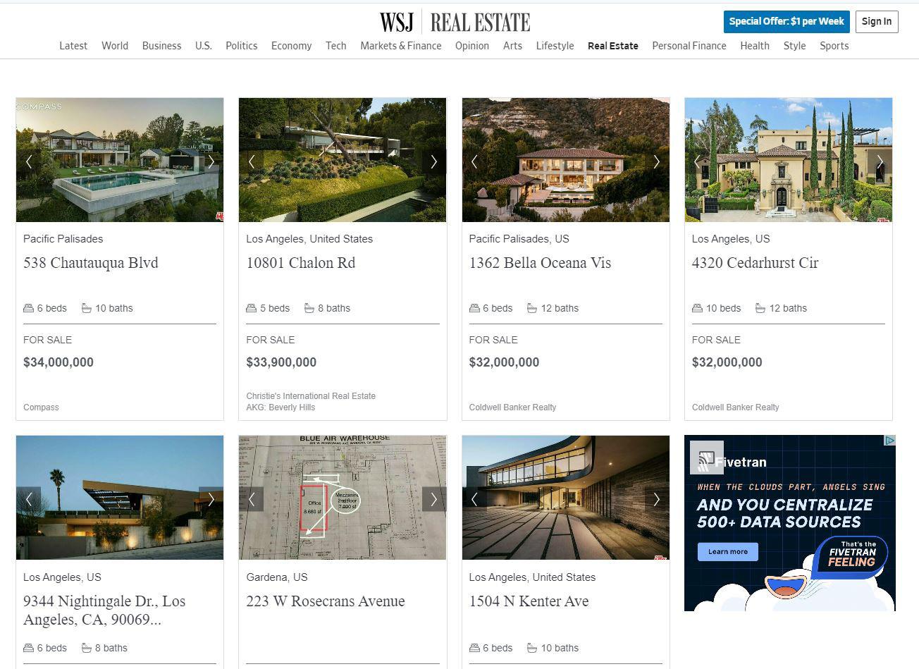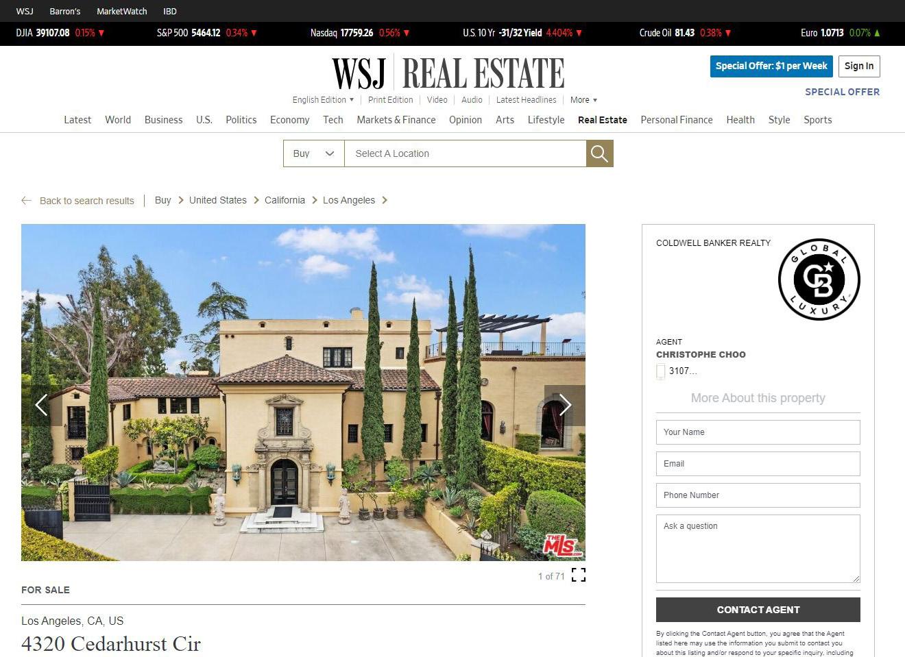 • Showcased your premier property in the 5/24-6/23 issue on the WSJ.com and MansionGlobal.com top market tile page for Los Angeles. This tile ad, one of only four on the page, showcased your premier listing and provided regionally relevant editorial. These sites attract millions of unique visitors per month.