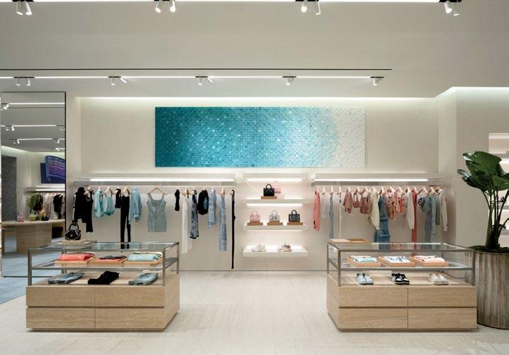 COURRÈGES’ frisson is back in Costa Mesa. The French label, known for its founder’s minimalist futurism, became the first designer boutique to open at South Coast Plaza in 1975, after being lured by Henry Segerstrom. Now the architectural line is returning under creative director Nicolas Di Felice, whose bias-cut slip dresses, strapless gowns, wide pants, strategic slashes, latex footwear, and blindfoldinspired sunglasses join strategically pocketed trench coats inside the new space. Belgian architect Bernard Dubois devised chrome pillars along with mirrored ceilings and dressing rooms plus white floors, furniture, and railings to house the men’s and women’s collections. Accessories and jewelry are housed in a monolithic island at the space’s center. The house codes are all here, but the suggestive pieces are also forward-looking. 3333 Bristol St., South Coast Plaza, Costa Mesa, 714-8523777; courreges.com. E.V.