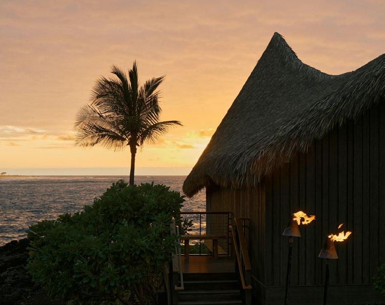 One of the most storied properties in Hawaii, beloved by Jim Morrison and Steve Jobs, KONA VILLAGE, A ROSEWOOD RESORT reopened in 2023 after a devastating tsunami seven years earlier. Now the 81-acre property is enjoying a renaissance. With oversized lanais and outdoor showers, the hales (“house” in Hawaiian), designed by California’s Nicole Hollis, are modeled after traditional structures with thatched roofs that look out on gardens, a lagoon, mountains, or the ocean. Douglas fir shiplap lines the walls, and much of the decor, like the kapaprinted pillows, are made by local artists. Work up a sweat in one of the sailing canoes launched off Kahuwai Bay beach before indulging in a mai tai and sashimi from the original Shipwreck Bar (made from a salvaged sailboat). The bar joins two restaurants that cater to guests’ every craving: Moana serves heavenly Hawaiian malasada doughnuts at breakfast, and Kahuwai Cookhouse uses wood fire to prepare barbecued Kumamoto oysters and crispy pork fritters. Preservation is another priority at Kona, which uses only solar power and sources art solely from native Hawaiians. Guests wishing to connect more deeply with the island’s heritage can take hula, lei-making, and fishing lessons. rosewoodhotels.com/en/kona-village.
