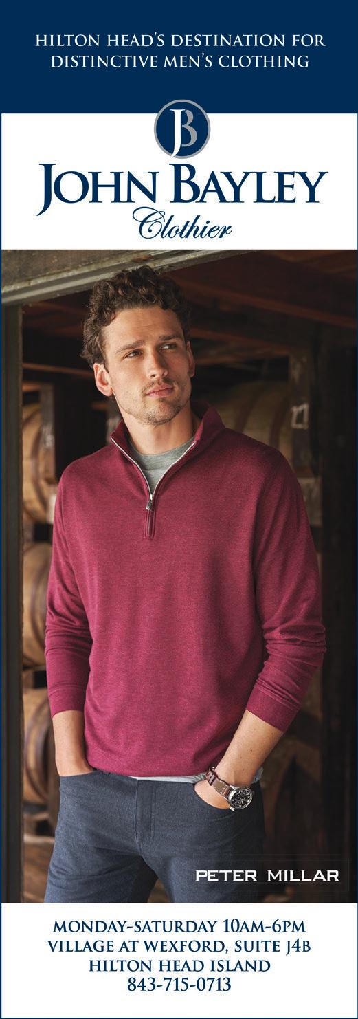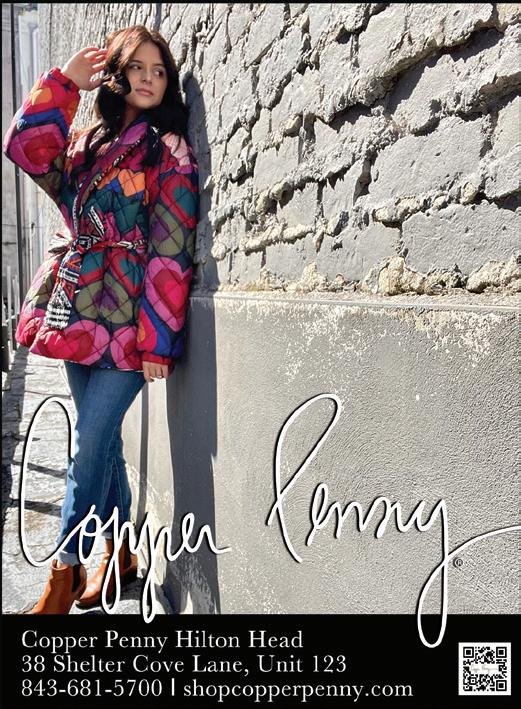 Touring the Lowcountry’s premier neighborhoods 94 STEP INTO THE PICKLEDOME If you need some pointers on getting out there and swatting the pickleball around, we’ve gathered up some of the biggest local names in the sport. Read on, and then we’ll see you out on the court. WHERE THERE’S A WHIPPOORWILL, THERE’S A WAY How Marissa Paykos and James Young turned a few acres into a new way of looking at farming. 52 20 28 WHAT’S INSIDE 39 C2 GIFT GUIDE FOR HIM 59 THE GREATEST GENERATION, PART ONE 66 LOWCOUNTRY VETREPRENUERS: FIVE VETERAN ENTREPRENEURS SHARE THEIR SECRETS TO TRANSLATING MILITARY TRAINING INTO BUSINESS SUCCESS. 72 THE SUNSHINE FAMILY: LOCAL ORGANIZATION, ‘POCKETS FULL OF SUNSHINE,’ ADDS PURPOSE, PRIDE, AND MEANING TO THE LIVES OF ADULTS WITH DISABILITIES. 78 THE SANDBOX: SPECIAL EVENTS AND THEME NIGHTS GIVE FAMILIES EVEN MORE REASONS TO VISIT THE LOWCOUNTRY’S FAVORITE FAMILY FUN SPOT. 83 C2 SPECIAL SECTION: REALTORS OF THE LOWCOUNTRY 102 ON POINT IN PALMETTO BLUFF 108 THE BANNONS HAVE CROSSED A LINE: BLUFFTON’S FAVORITE HUSBAND-AND-WIFE LEGAL EAGLES ARE TAKING THEIR SHOW ON THE ROAD. ON OUR COVERS ON THE CH2 COVER Outfit by Birdie James Sunglasses by Eyeland Optique Photography by 2Lights, 1Stand ON THE CB2 COVER Outfit by Kelly Caron Curated Photography by 2Lights, 1Stand PLUS PALMETTO BLUFF’S premier neighborhoods WHEN THERE How Marissa Paykos and James Young turned few acres into new way of looking at farming. THANKFUL TRENDSETTER GIFT GUIDE FOR HIM HOLIDAY TRADITIONS