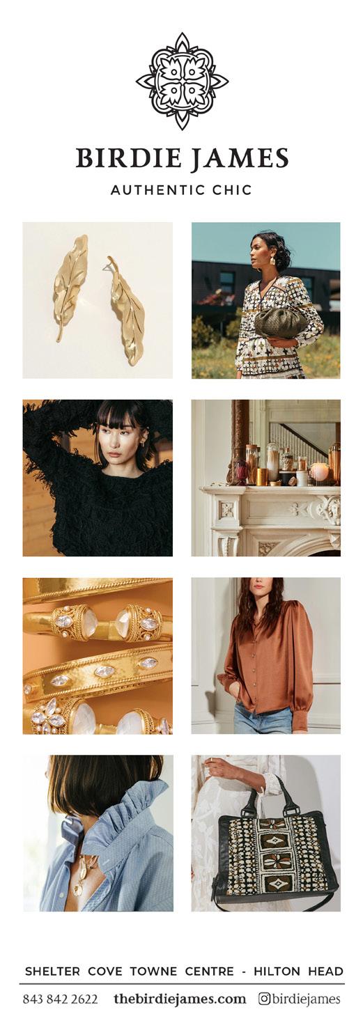 NOVEMBER 2022 PLUS NOVEMBER 2022 CB2 CELEBRATE BLUFFTON AND BEYOND NEIGHBORHOOD STROLL: PALMETTO BLUFF’S WILSON VILLAGE Touring the Lowcountry’s premier neighborhoods WHERE THERE’S A WHIPPOORWILL, THERE’S A WAY How Marissa Paykos and James Young turned a few acres into a new way of looking at farming. THANKFUL TRENDSETTER As the weather turns cooler in the Lowcountry, the focus is on layers and thoughtful accessories. GIFT GUIDE FOR HIM HOLIDAY TRADITIONS
