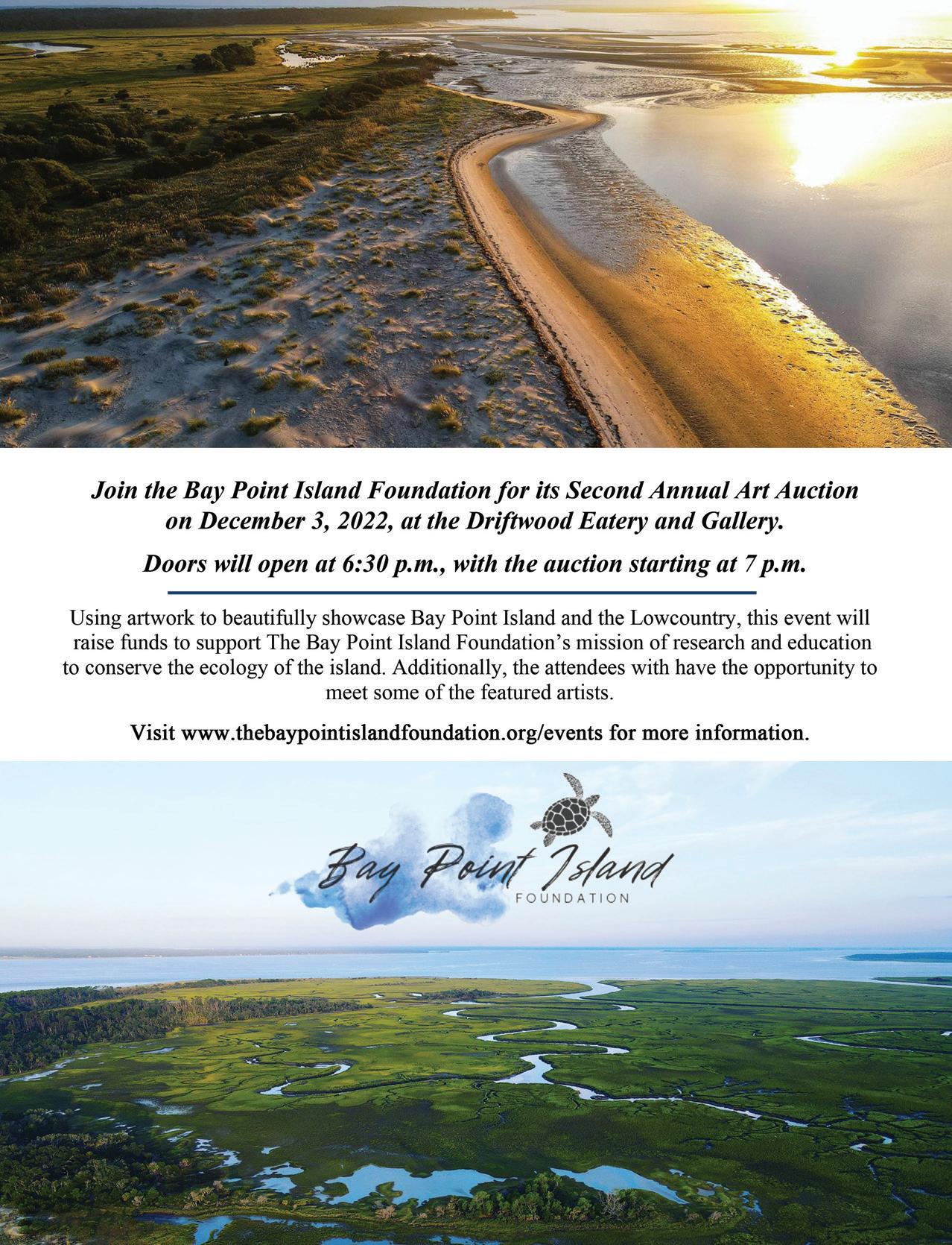 The Bay Point Island Foundation (TBPIF)’s second annual Art Auction will be held on December 3 at the Driftwood Eatery and Gallery, 5 Waterway Lane, Hilton Head Island. The doors will open at 6:30 p.m. with the auction starting at 7 p.m. This annual event supports Foundation projects, resources, and research that conserve and protect the flora and fauna of Bay Point Island.
