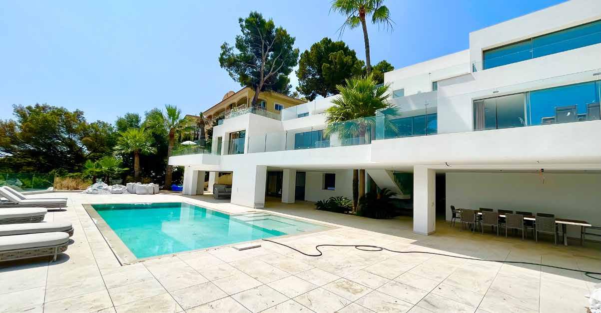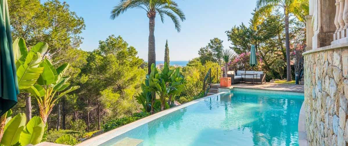 Who wouldn’t like to have the of taking a dip in the sixteen-metre pool in the morning or walking 300 metres to Bendinat beach and jumping into the sea. Alternatively, the day could start in the well-equipped fitness room or with a view of the sea while having breakfast on one of the three spacious terraces. This villa, which has been renovated to a very high standard, impresses with its very good quality, quiet location and first-class furnishings. As soon as you enter the villa, you have a very pleasant living feeling - the house has been renovated with great attention to detail and charm and is ideal for couples and families who would also like to live on the island all year round. The spacious living-dining area with an adjoining open designer kitchen is ideal for receiving guests or reading a book in front of the fireplace. There is also a bedroom with bathroom on this level, from where you have a great view of the infinity saltwater pool. A few steps lead to the upper floor - here you will find 3 more bedrooms sharing a bathroom as well as the spacious master bedroom with en-suite bathroom and terrace overlooking the sea. The spacious and charming house has air conditioning, underfloor heating, gas fireplace, Sonos sound system, Google surveillance, Klafs sauna, Italian designer furniture and is ready to move in fully equipped. The photovoltaic system with connected battery storage and wallbox produces a significant part of the electricity requirements. With the latest insulation and Cortiso windows, the house meets the most modern energy standards. The extensive and private garden with adjoining terrace invites you to linger on sunny days - the ideal property to feel comfortable outdoors as well as indoors all year round!