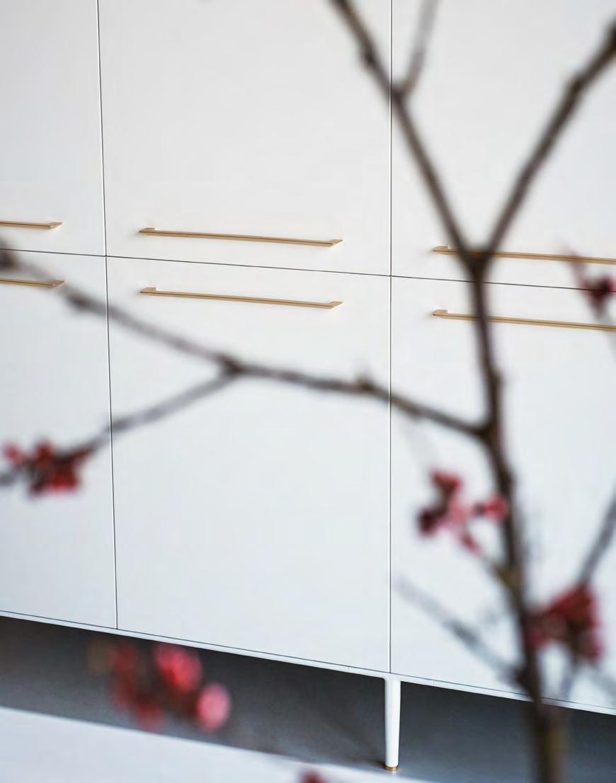 ÎLOT: Portes en laqué soie Laguna, structure aluminium Laguna, poignées Eero Champagne.
