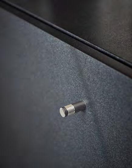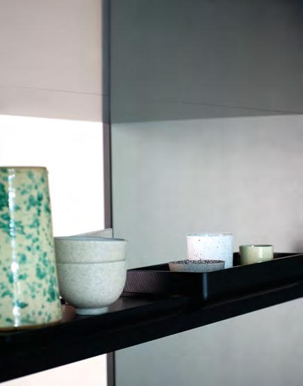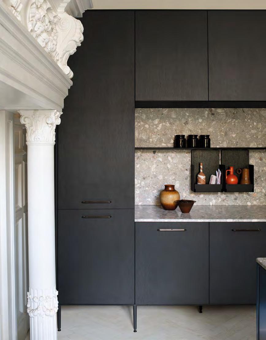 UNIT POCKET H 234: Lantanio melamine doors, Oi handles and Nickel Nero Lucido feet, worktop in Fior di Pesco engineered stone. Black Dressup Line with splashback in Fior di Pesco engineered stone.