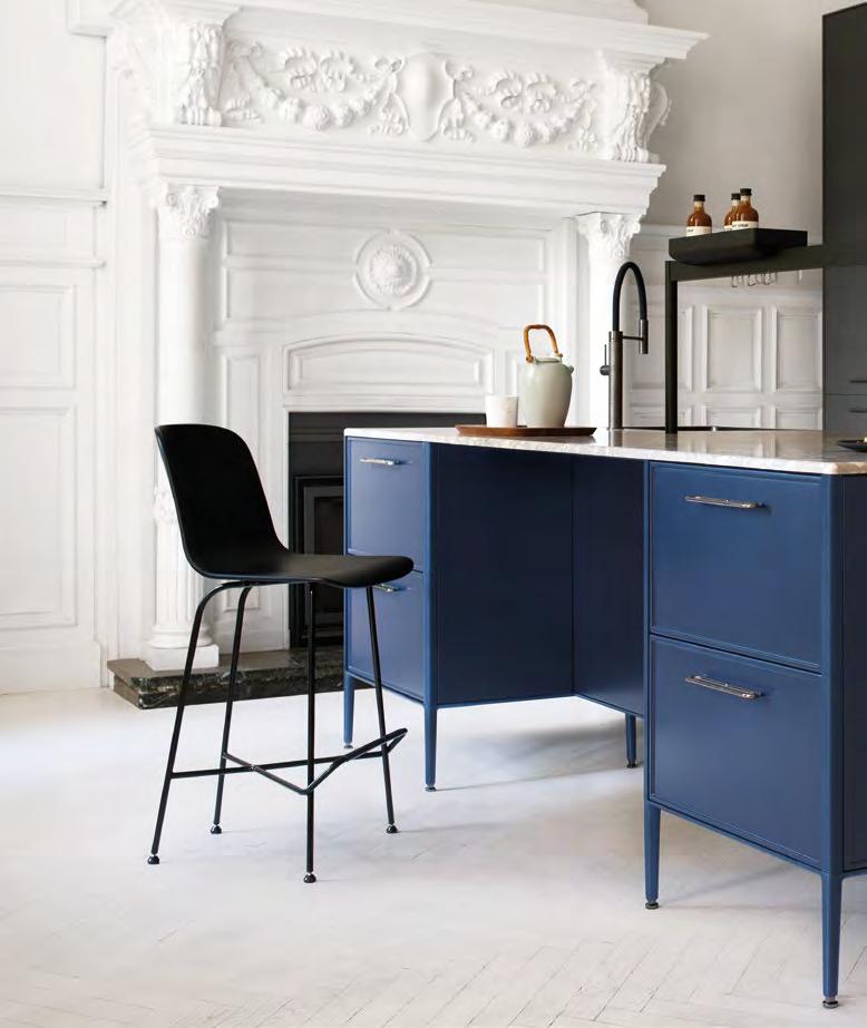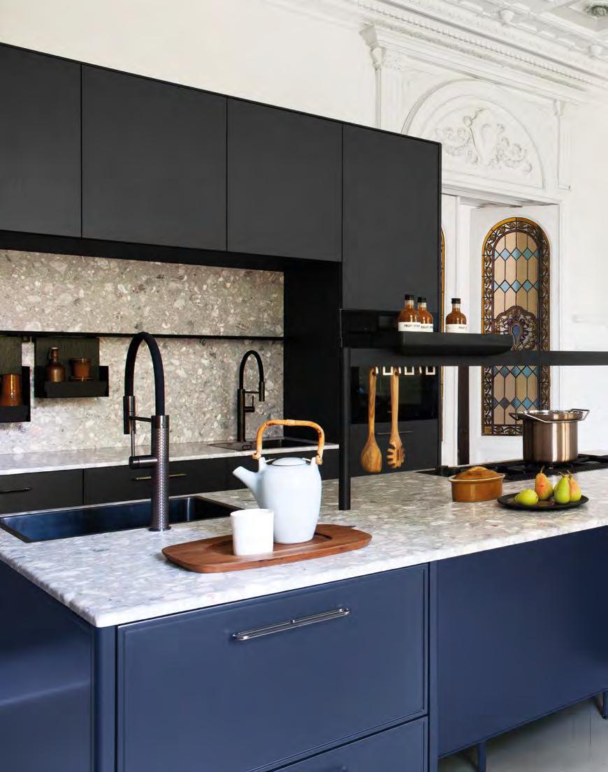 ILÔT AVEC SNACK: Portes Shaker en laqué effet métallique Blu Fes Anodyc, structure aluminium laqué Blu Fes, poignées Oi et pieds Nickel Nero Lucido, plan de travail en pierre reconstituée Fior di Pesco.