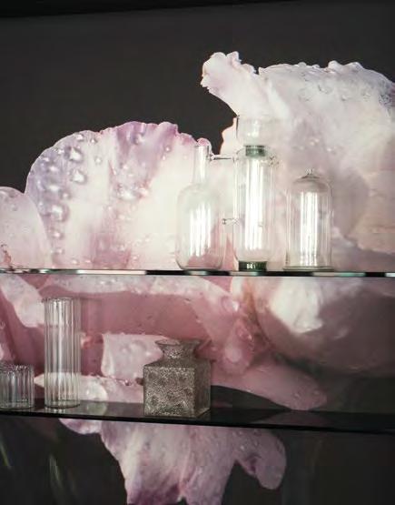 UNIT CUPBOARDS H 138: D oors in Specchiato Cannettato glass, Nero silkeffect lacquered carcass, Nichel lacquered top panel and structure, feet Nickel Nero Lucido.