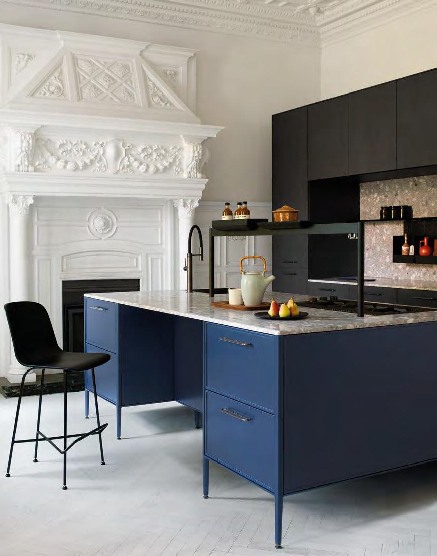 ОСТРОВ СО СТОЛЕШНИЦЕЙ: Створки Shaker в лакировке с металлическим эффектом Blu Fes Anodyc, каркас из алюминия в лакировке Blu Fes, ручки Oi и ножки отделке Nickel Nero Lucido, столешница из агломерата Fior di Pesco.