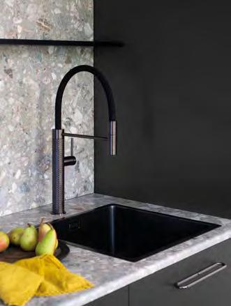 Lantanio, tiradores Oi y patas Nickel Nero Luido, encimera en conglomerado Fior di Pesco. Dressup Line negro con panel en conglomerado Fior di Pesco.